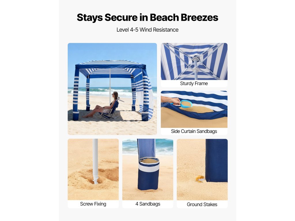 Každý roh snadno sestavitelného stanu Cabana je vybaven pytli s pískem a kolíky v zemi pro bezpečné ukotvení. Boční zástěna obsahuje také pytle s pískem, které zabraňují jejímu odfouknutí, a využívá váhu písku ke zvýšení celkové stability.