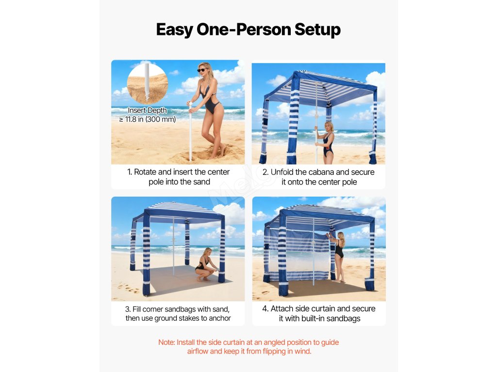 Tento plážový stan Cabana může rychle postavit a zajistit jedna osoba bez složité montáže. Boční závěs by měl být instalován v šikmé poloze, aby usměrňoval proudění vzduchu a zabránil převrácení kabany ve větru.