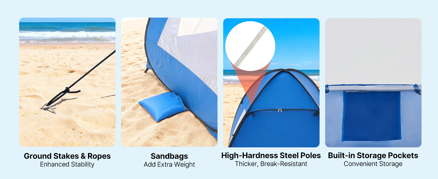 Tento kempinkový přístřešek na slunce je vybaven zesílenými podpěrnými tyčemi, větruvzdornými lany a zemními kolíky, které jej udržují na místě. Stvořený pro větrné pláže a pobřeží s nárazovými větry - váš stín zůstane na místě, zatímco vy budete odpočívat.