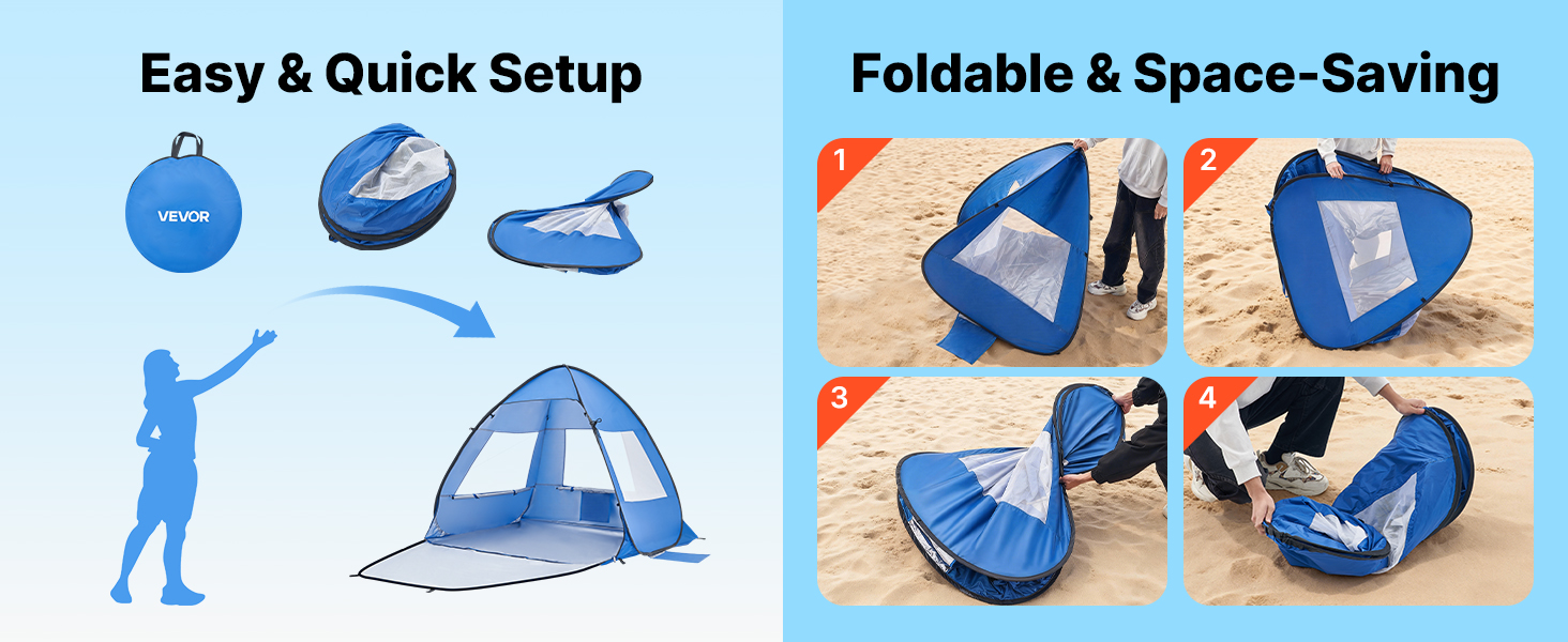 Náš přenosný plážový stan poskytuje dostatek stínu, který vás i vaši rodinu ochrání před ostrým přímým sluncem a zajistí vám pohodlný a pohodový den.