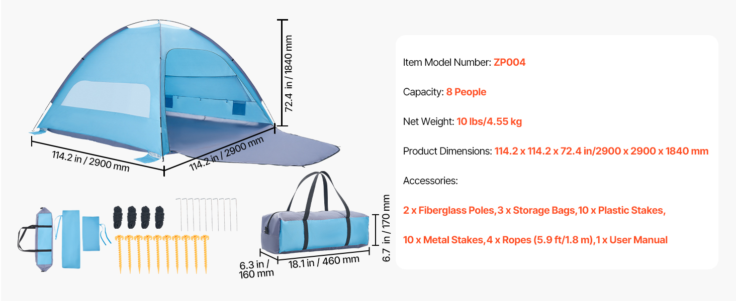 Tento kempinkový přístřešek na slunce je vybaven zesíleným sklolaminátem, větruvzdornými lany, zemními kolíky a pytli s pískem, které jej udržují na místě. Stvořen pro větrné pláže a pobřeží s nárazovými větry - váš stín zůstane na místě, zatímco vy budete odpočívat.