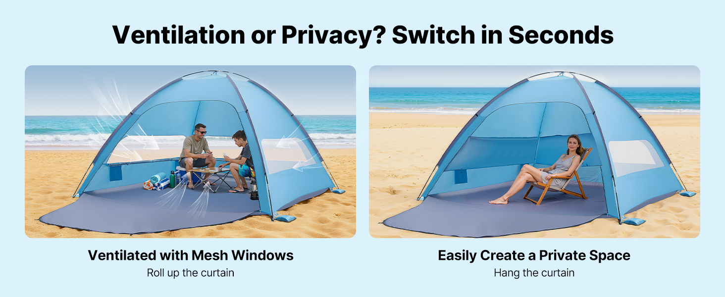 Náš přístřešek proti slunci umožňuje otevřít velká síťovaná okna pro proudění vzduchu a mořský vánek nebo zavěsit závěsy a vytvořit tak uvnitř stanu soukromý prostor ve stínu.