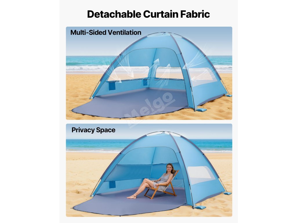 Náš přístřešek proti slunci umožňuje otevřít velká síťovaná okna pro proudění vzduchu a mořský vánek nebo zavěsit závěsy a vytvořit tak uvnitř stanu soukromý prostor ve stínu.