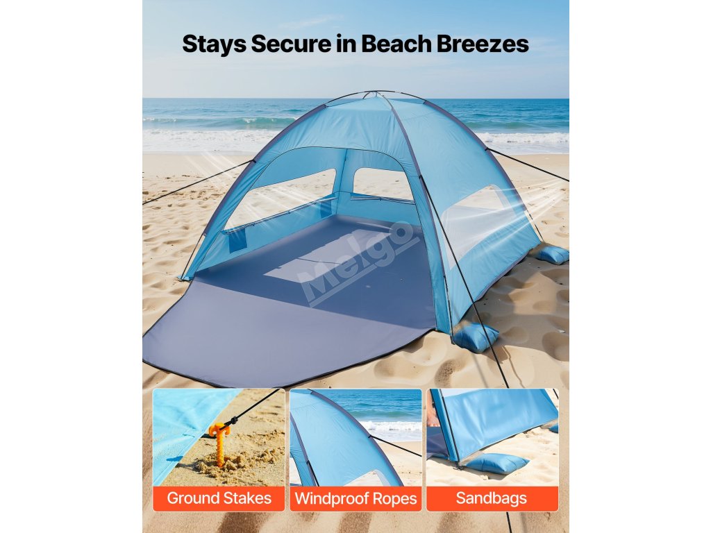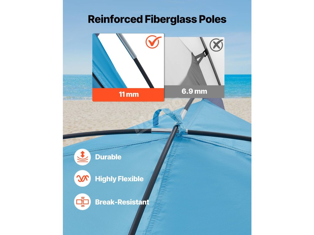 Tento kempinkový přístřešek na slunce je vybaven zesíleným sklolaminátem, větruvzdornými lany, zemními kolíky a pytli s pískem, které jej udržují na místě. Stvořen pro větrné pláže a pobřeží s nárazovými větry - váš stín zůstane na místě, zatímco vy budete odpočívat.