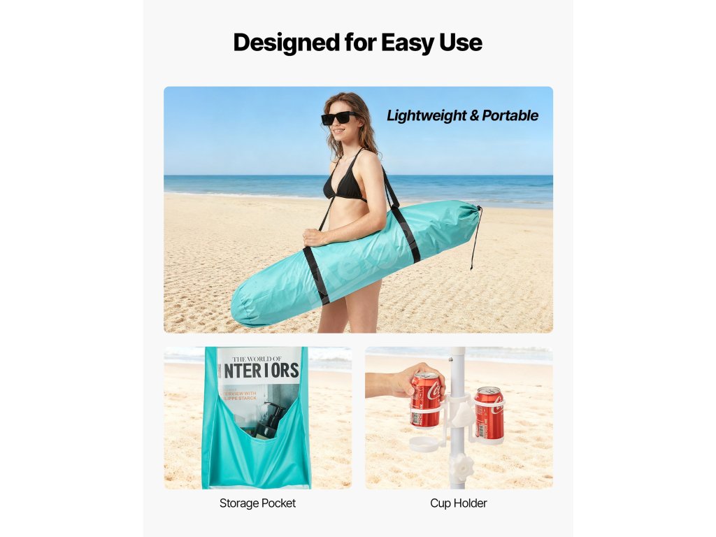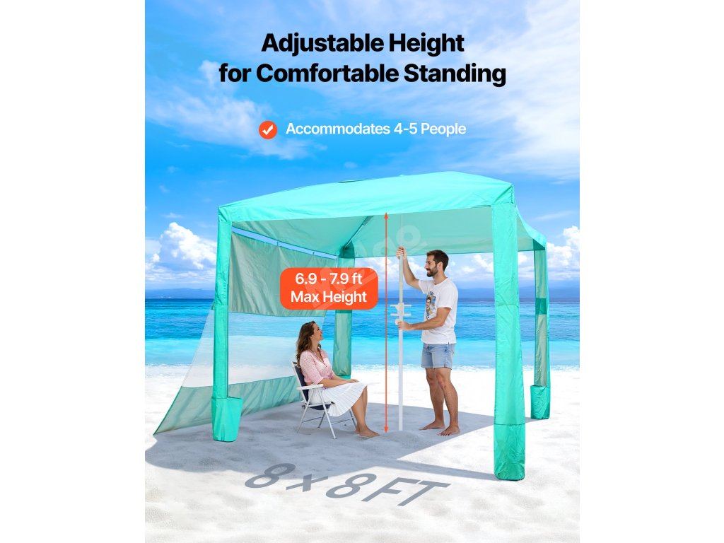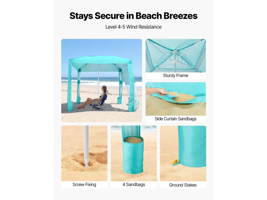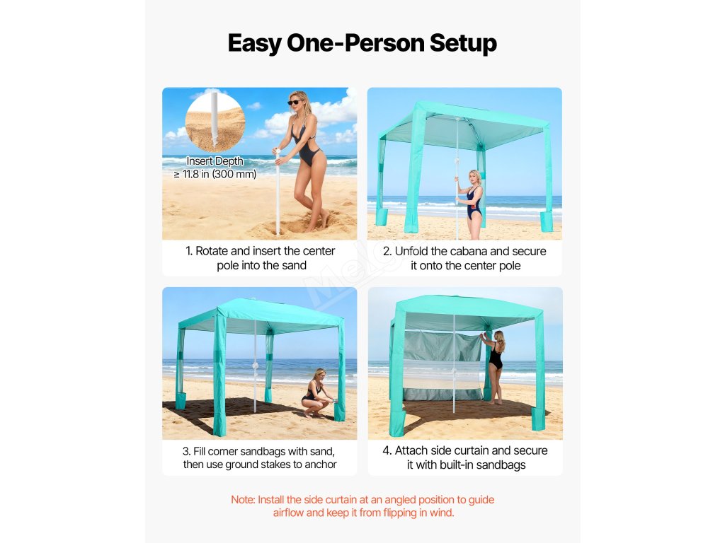 Tento plážový stan Cabana může rychle postavit a zajistit jedna osoba bez složité montáže. Boční závěs by měl být instalován v šikmé poloze, aby usměrňoval proudění vzduchu a zabránil převrácení kabany ve větru.