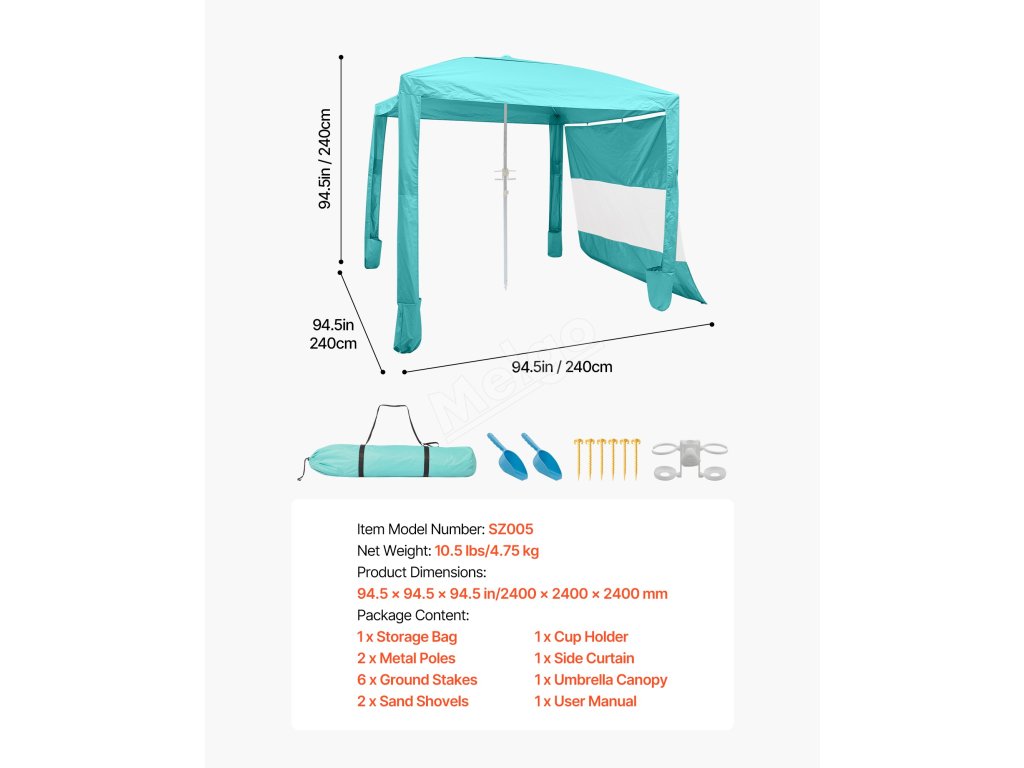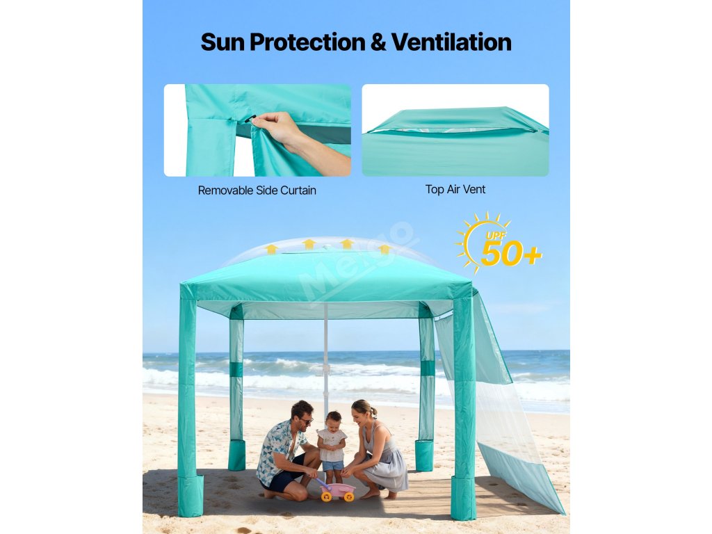 Tato velká plážová kabina, která poskytuje ochranu před sluncem až UPF 50+, je vybavena odnímatelným bočním závěsem. Připevněte ji pro maximální stín nebo ji odpojte a užijte si otevřený, dobře větraný prostor.