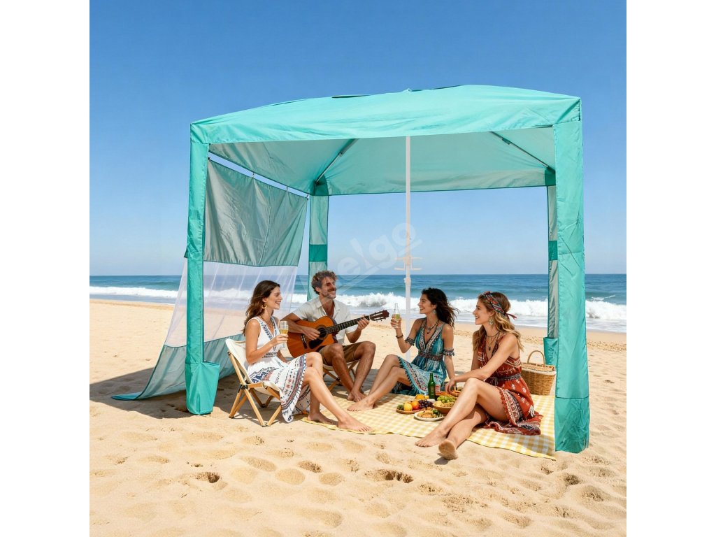 Plážový stan s boční stěnou 2.4×2.4 m, upf 50+, nastavitelná výška