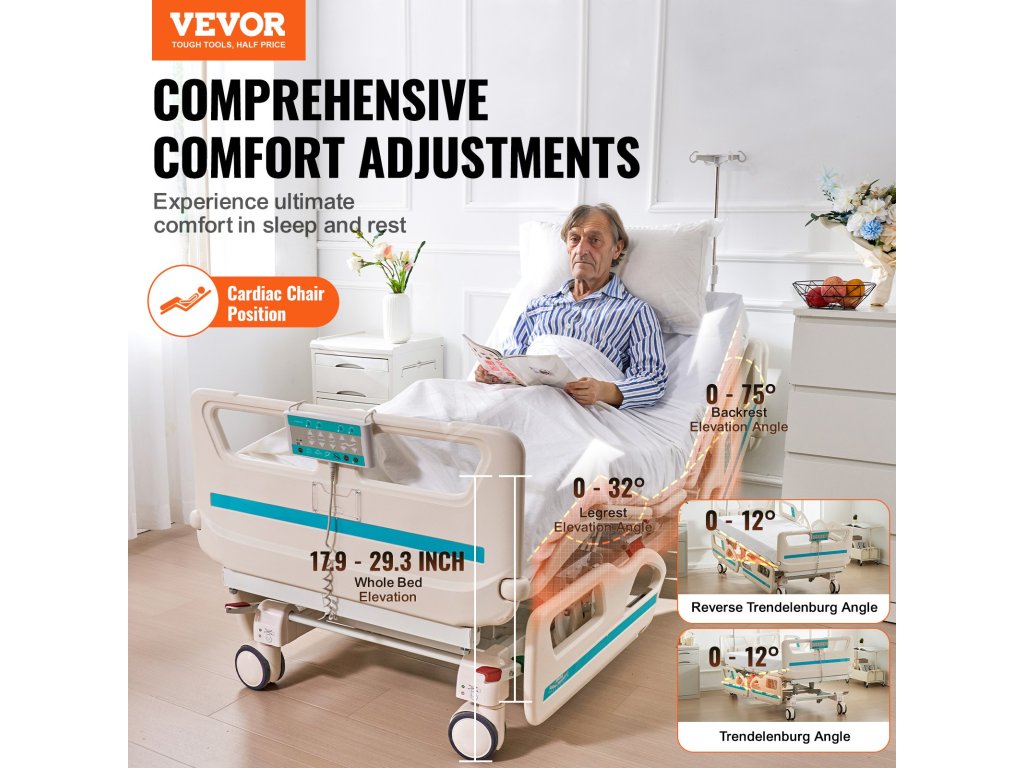 Objevte jedinečné pohodlí s plně elektrickým nemocničním lůžkem VEVOR s polohou srdečního křesla a 5 funkcemi nastavení. Bez námahy zvednete nebo snížíte celé lůžko (17,9-29,3 palce), nastavíte Trendelenburgovu a reverzní Trendelenburgovu polohu (0°-12°), úhel opěradla (0°-75°) a polohu nohou (0°-32°).