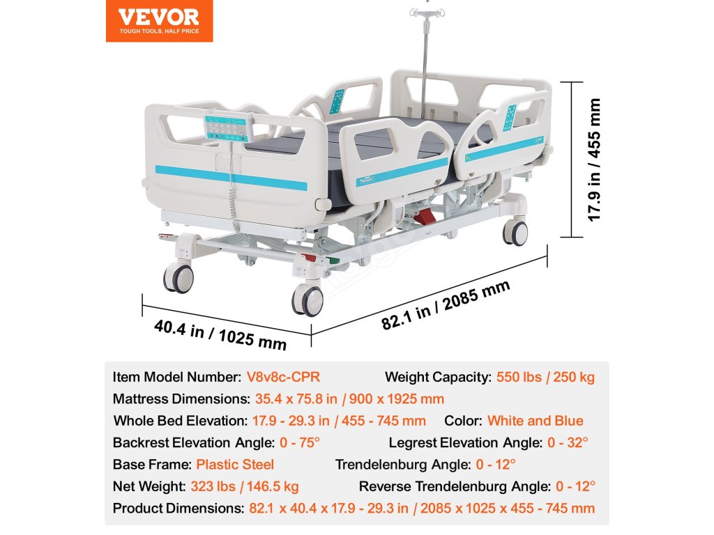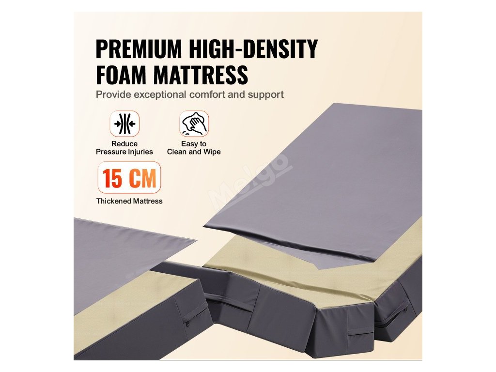 Elektrické nemocniční lůžko VEVOR pro jednotky intenzivní péče je vybaveno prvotřídní voděodolnou houbovou matrací, která nabízí výjimečné pohodlí a odolnost. Součástí balení je navíc infuzní tyč, takže lůžko je vynikající volbou jak pro nemocniční, tak pro domácí prostředí.