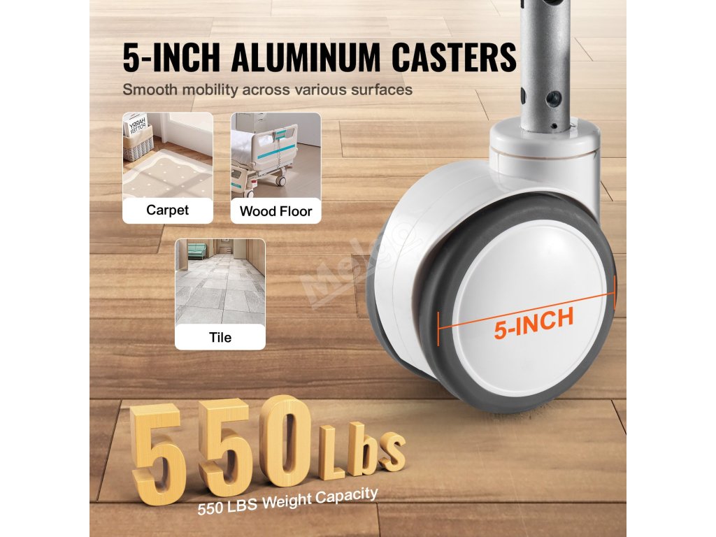 Toto plně elektrické nemocniční lůžko je vybaveno robustními 5palcovými kolečky s aretací, která se snadno pohybují po kobercích, dřevěných podlahách i dlaždicích. Tato odolná kolečka s nosností 550 kg zajišťují výjimečnou stabilitu a spolehlivost.