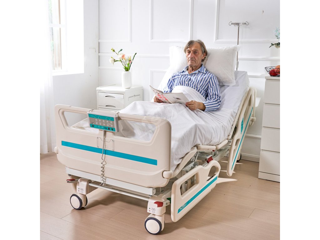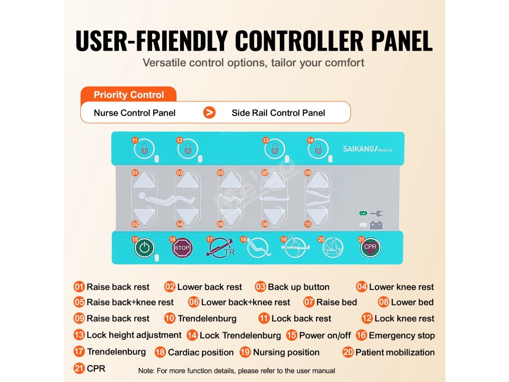 Zažijte jedinečné pohodlí s naším plně elektrickým nemocničním lůžkem s 5 funkcemi, které zahrnuje 2 možnosti ovládání. Vyberte si ovládací panel pro zdravotní sestru nebo ovládací panel s bočním panelem pro bezproblémové nastavení všech funkcí lůžka.