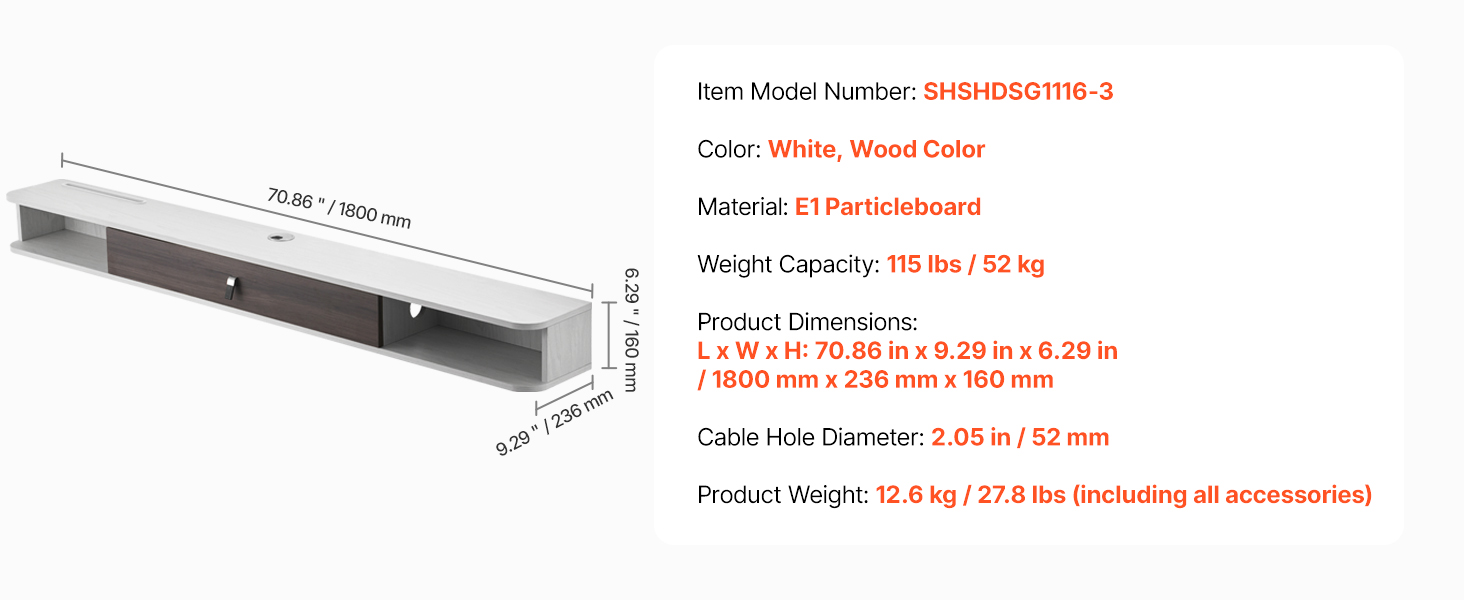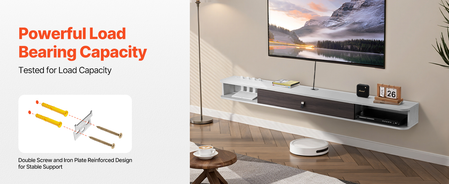Tato plovoucí police na TV s dvojitými šrouby a železnou deskou zaručuje stabilitu a odolnost. Byla testována na nosnost, aby unesla těžké předměty, takže se můžete spolehnout, že bezpečně udrží váš televizor a zařízení.