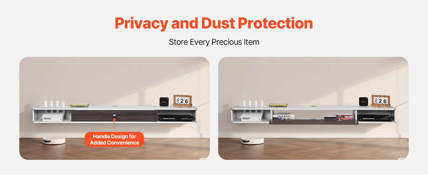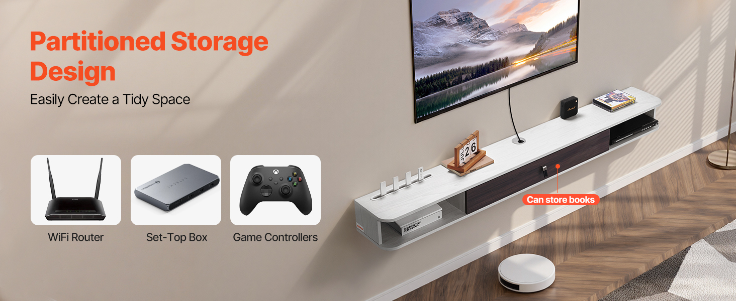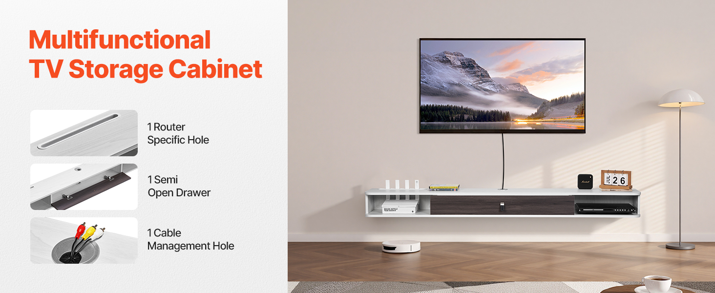 Tento plovoucí televizní stojan je vybaven speciálním slotem pro router a splní vaše požadavky na úložný prostor. Polootevřené zásuvky poskytují přehledný úložný prostor, který je ideální pro uspořádání DVD přehrávače a dalších předmětů. Otvory pro vedení kabelů jsou speciálně navrženy tak, aby skryly změť kabelů a udržely váš prostor uklizený.