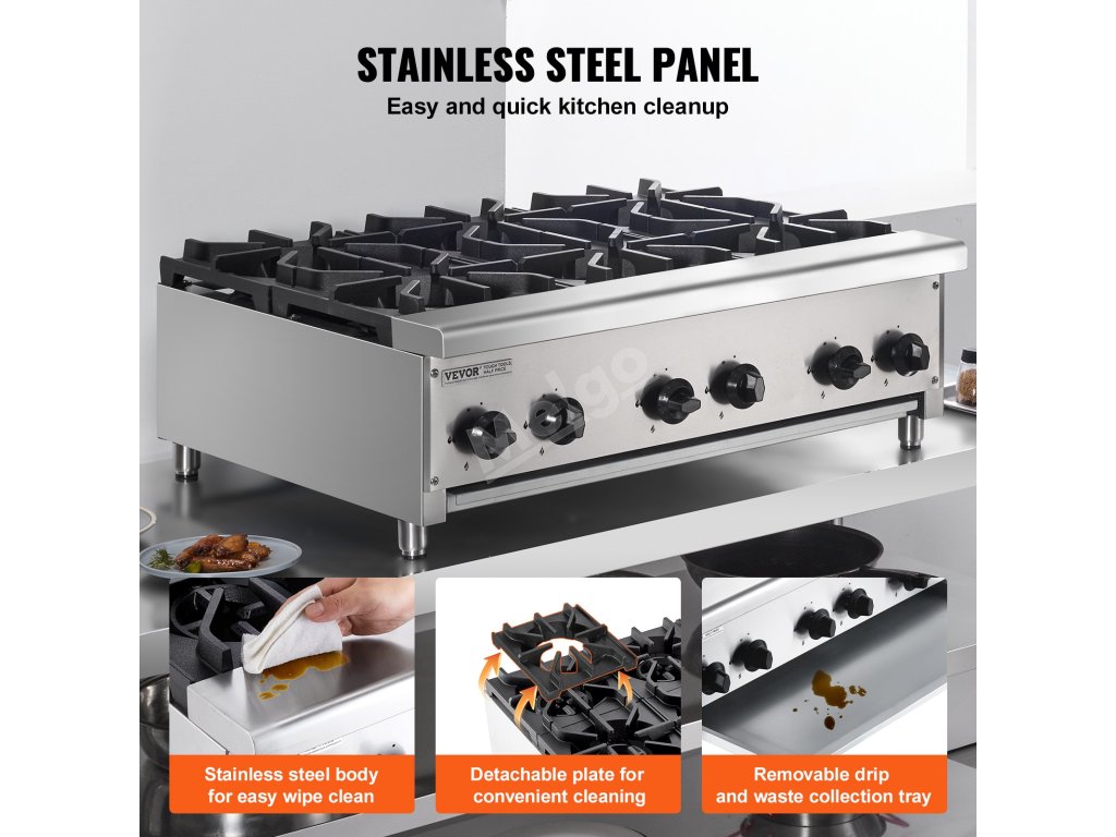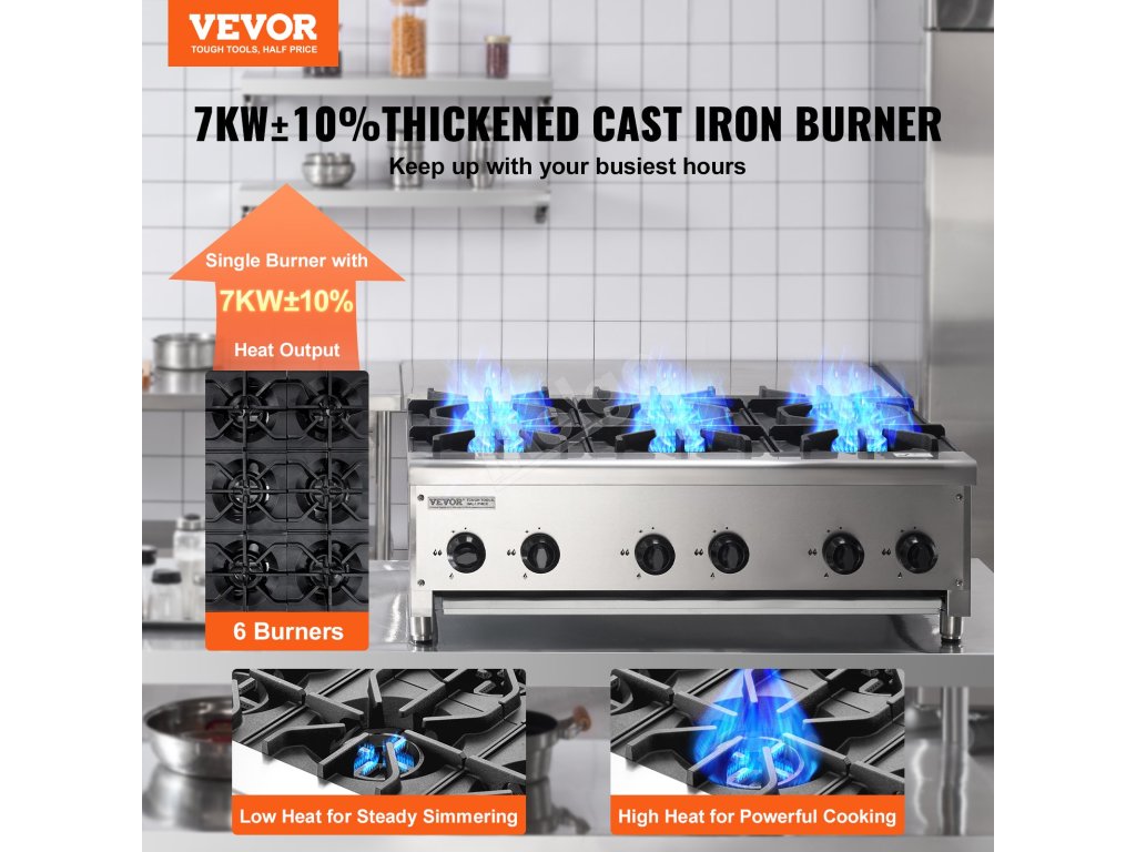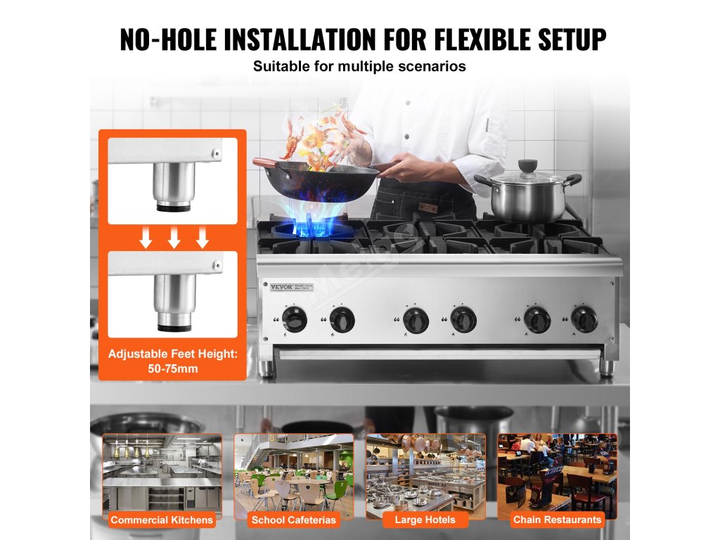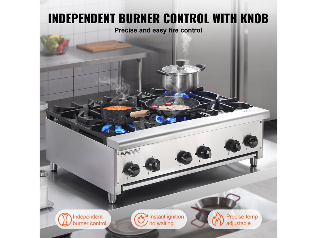 Komerčný plynový sporák má 6 horákov na nezávislé varenie. Vyberte si požadovaný horák, okamžite ho zapáľte a použite ergonomický gombík na ovládanie bez námahy. Ľahko pripravíte rôzne pokrmy.