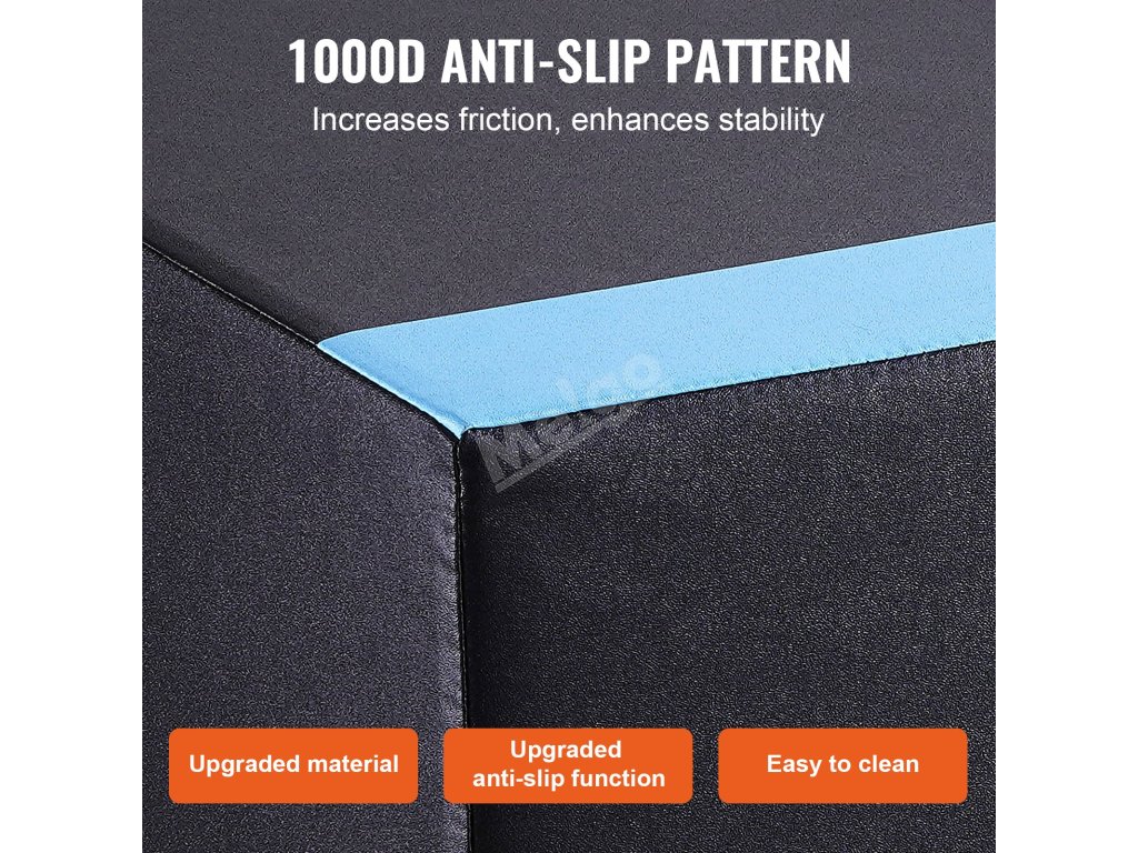 Vylepšený neklouzavý povrch s přilnavým vzorem 1000D, který svou odolností, počtem vláken a hustotou předčí běžnou síťovinu 500D. Zvyšuje tření a stabilitu. Vyplněno recyklovaným bavlněným materiálem, který zvyšuje celkovou hmotnost a zlepšuje stabilitu a poskytuje bezpečné prostředí pro trénink skoků.