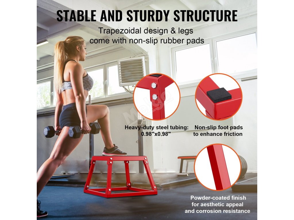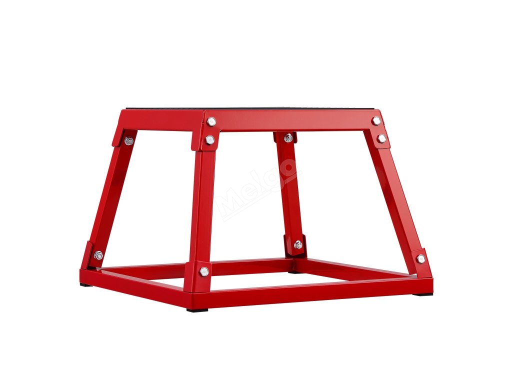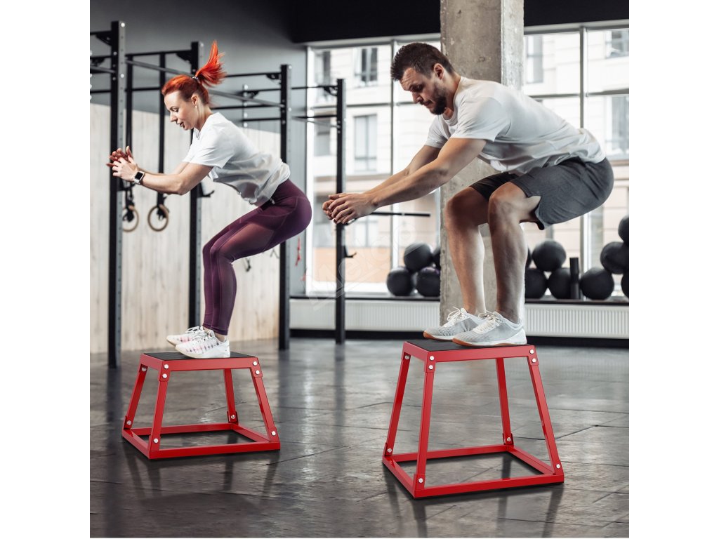 Tréninkový plyo box se čtyřmi gumovými podložkami ve spodní části a texturovaným silikonovým povrchem v horní části, který zajišťuje stabilitu a přilnavost pro bezpečné a efektivní cvičení. Povrch ocelových trubek je opatřen práškovou barvou pro vizuálně atraktivní a korozivzdornou povrchovou úpravu.