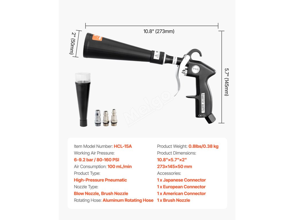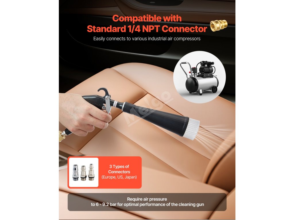 Tato všestranná čisticí pistole na automobily je vybavena 2 tryskami a 360° otočnou konstrukcí pro hloubkové čištění vozidel, vysokotlakou rotační tryskou 6-9,2 bar a energeticky úspornou spotřebou vzduchu 100 ml/min. Tato pistole je kompatibilní s konektory 1/4 NPT pro různé vzduchové kompresory.