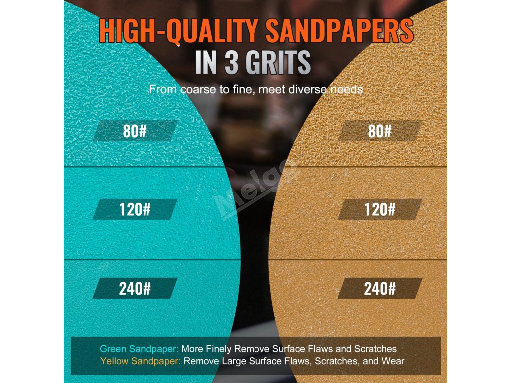 36 brusných papírů poskytuje 3 různé zrnitosti (zrnitost 80/120/240). Žluté brusné papíry vynikají při odstraňování velkých povrchových vad, škrábanců a opotřebení, zatímco zelené brusné papíry zvládnou drobné vady a škrábance při jemnějším broušení.