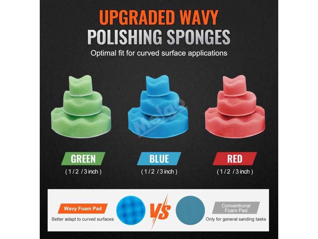 součástí balení je 9 podložek z vlnité pěny (1/2/3 palce), které vám pomohou snadno zvládnout broušení zakřivených povrchů. Tyto vlnité pěnové podložky nabízejí vynikající přizpůsobivost zakřiveným povrchům, včetně ohybů a nepravidelných tvarů, což vede k efektivnějšímu a přesnějšímu leštění.