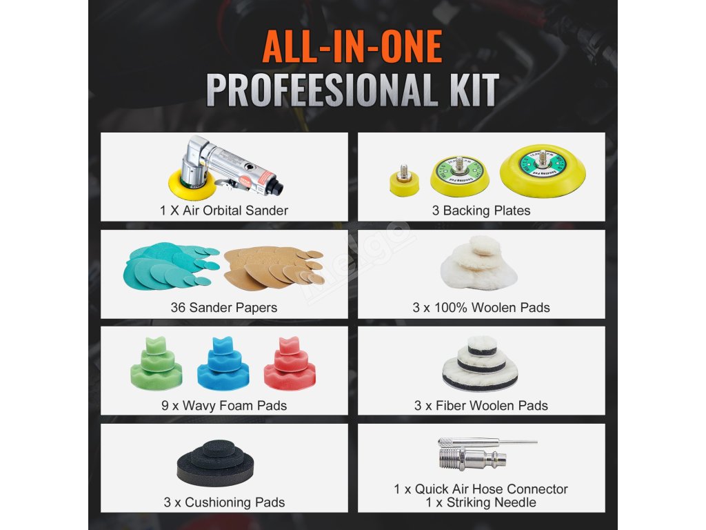 Pneumatická excentrická bruska 2.5/5.1/7.6 cm, 15000 r/min, 58 dílů