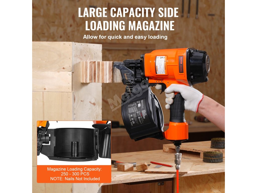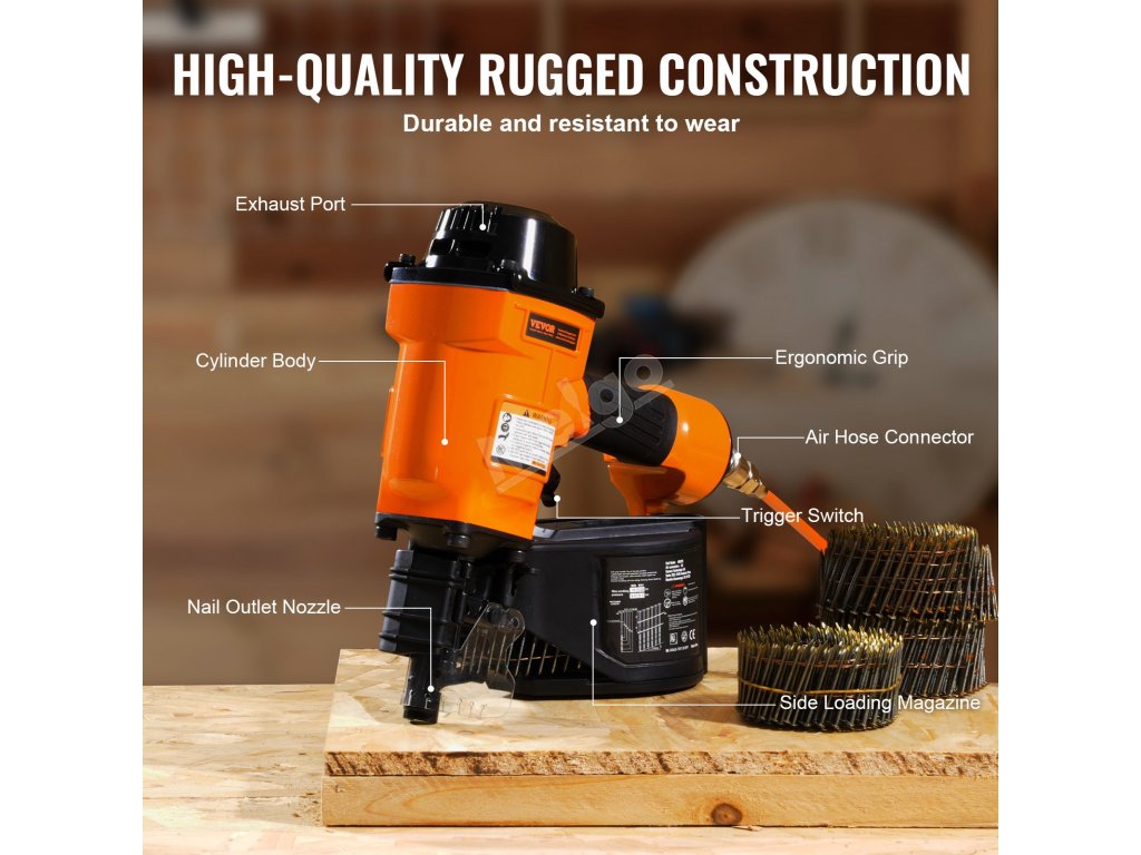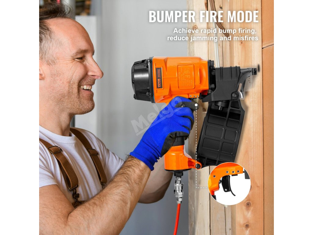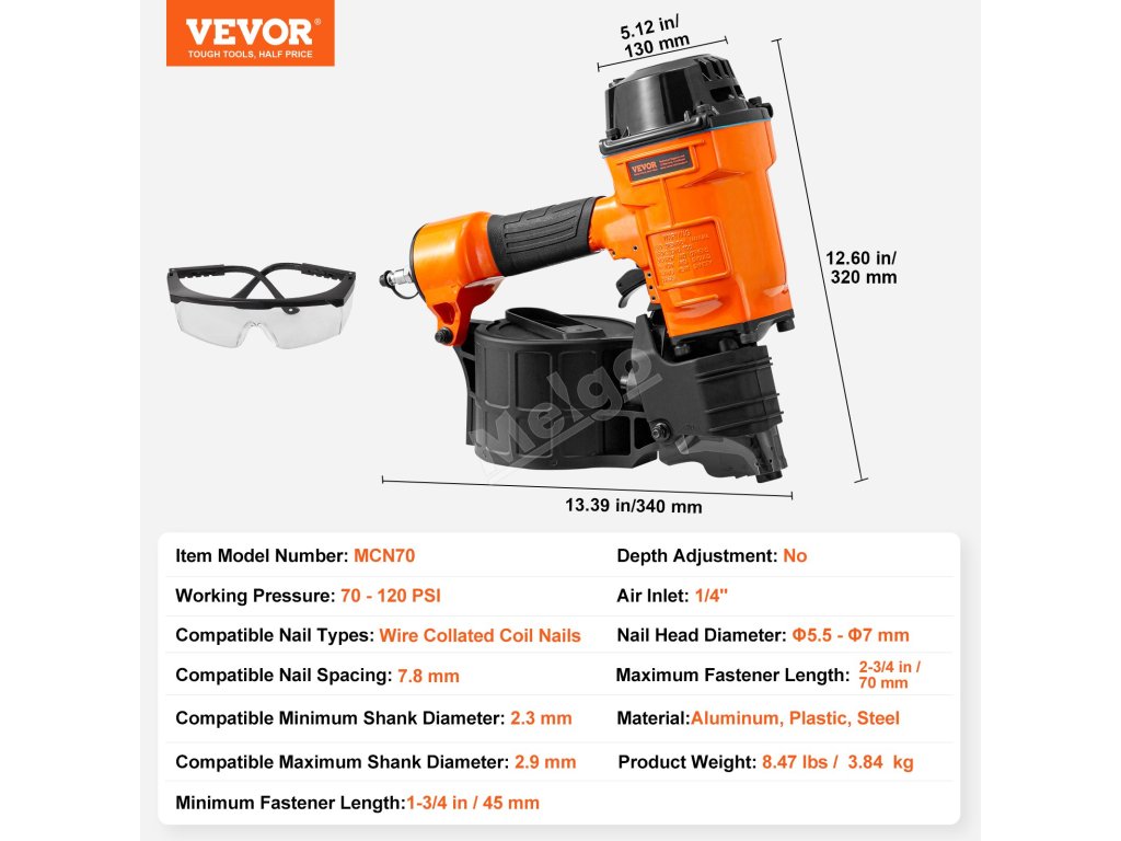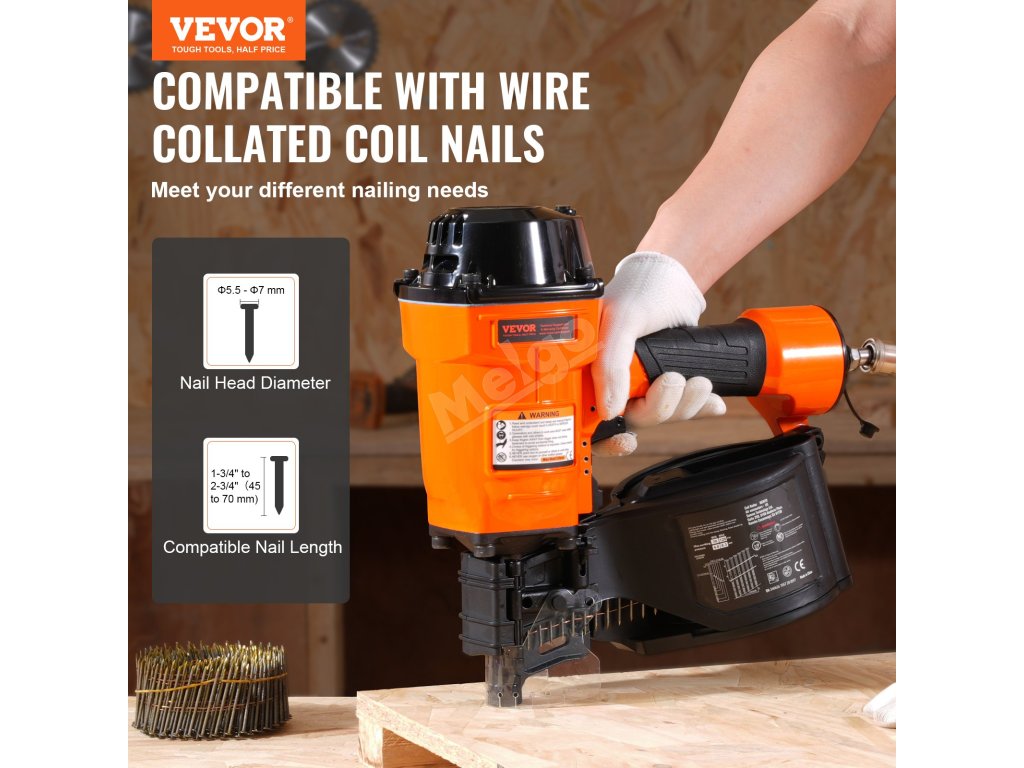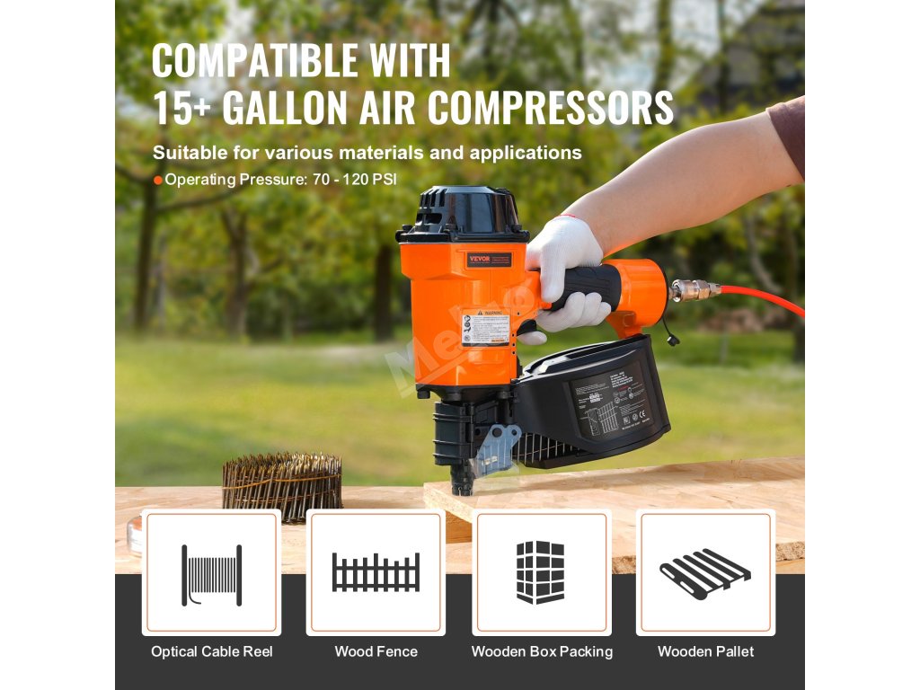 Pneumatická hřebíkovačka VEVOR je kompatibilní s drátěnými hřebíky o délce 1-3/4 až 2-3/4 palce. Je ideální pro přestavby a opravy v domácnostech, vyniká při opravách palet, dřevěných beden, plotů, beden a obecných stavebních prací, jako jsou obklady, palubky a opláštění.
