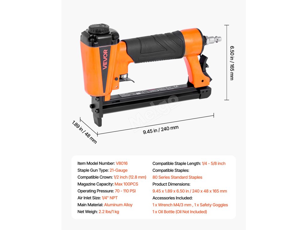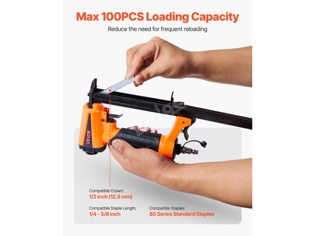 Tato pneumatická sponkovačka o průměru 21 mm je kompatibilní se standardními sponami řady 80 - velikost korunky 1/2" (12,8 mm) a délka sponky 1/4" až 5/8" (6 mm - 16 mm). Vysokokapacitní dobíjecí zásobník pojme až 100 sponek, což je ideální pro čalounictví, výrobu skříní, rámování nábytku a zpracování dřeva.