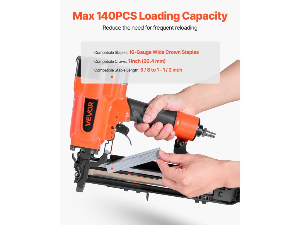 Tato vzduchová sponkovačka je vybavena velkokapacitním zásobníkem, který pojme až 140 sponek najednou, což minimalizuje potřebu častého dobíjení a umožňuje efektivnější provoz. (Sponky nejsou součástí dodávky; zakoupíte je prosím samostatně)