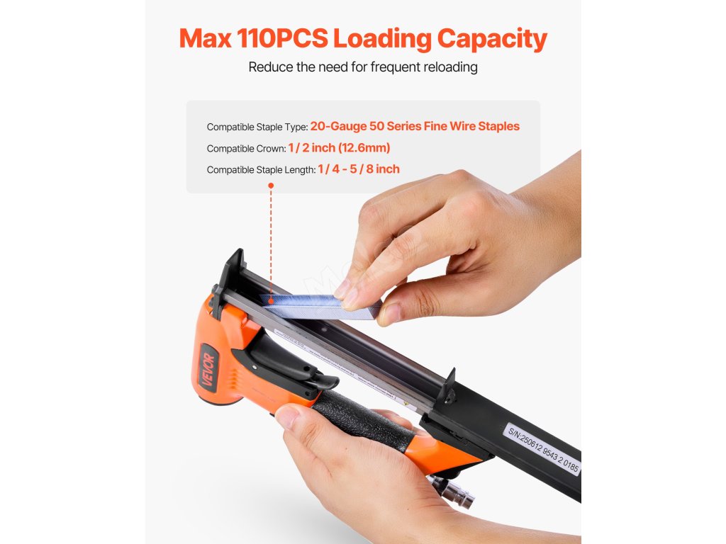 Tato vzduchová sešívačka je vybavena velkokapacitním nabíjecím zásobníkem, který pojme až 110 sponek najednou, což minimalizuje potřebu častého dobíjení a umožňuje efektivnější provoz. (Sešívačky nejsou součástí balení; zakoupíte je prosím samostatně)