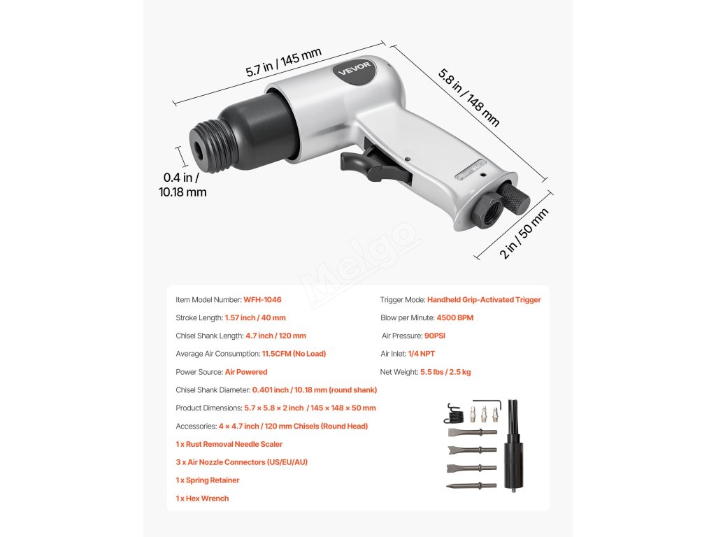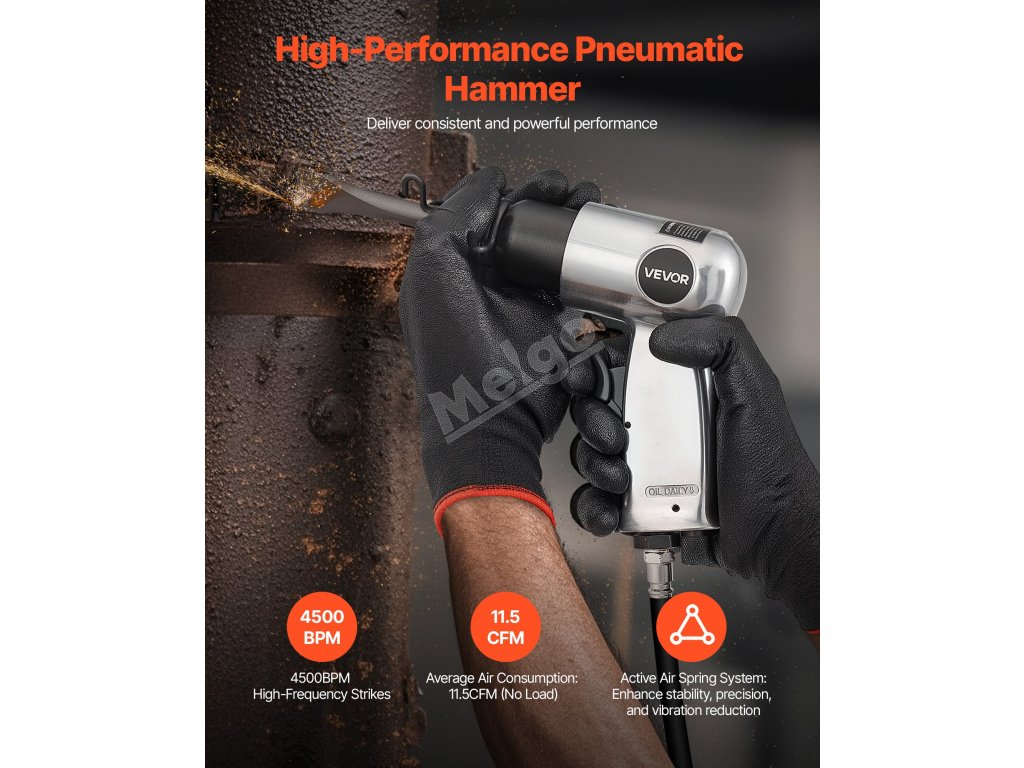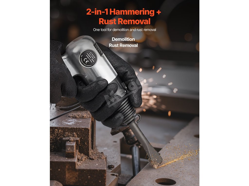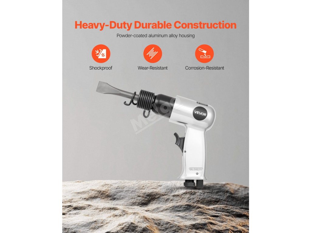 Vzduchové kladivo VEVOR poskytuje silný úderný výkon s vysokou frekvencí úderů 4500 BPM a zdvihem 1,57 palce, takže je ideální pro sekání kovu, rozbíjení betonových zdí, sekání podlah a odstraňování šroubů. Je vybavena pneumatickou jehlovou kostrou pro odstraňování rzi, 4 sekáči, funkcí spuštění jedním tlačítkem a ergonomickou rukojetí.