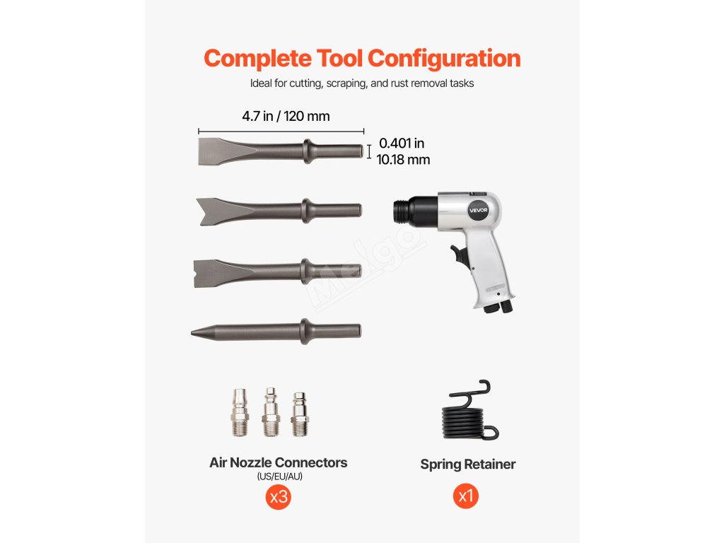 Naše pneumatické kladivo se dodává se 4 sekáči, 3 konektory vzduchové trysky, 1 jehlou na odstraňování rzi, 1 šestihranným klíčem a 1 pružinou, která bezpečně drží sekáč a umožňuje jeho snadnou výměnu - instalace a provoz jsou tak hračkou.