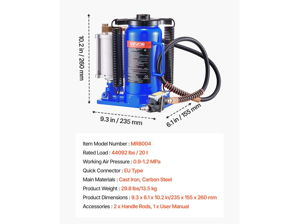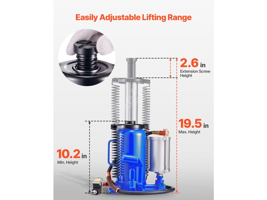 Tento ruční a pneumatický hydraulický zvedák lahví využívá hydraulickou sílu ke stabilnímu zvedání až 20 tun. Zvládne těžké úkoly, jako jsou opravy vozidel nebo domácí údržba skříňových nákladních automobilů, obytných vozů, pickupů a SUV.