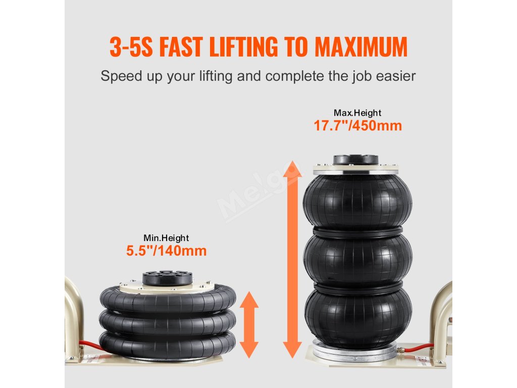 Náš zvedák se vzduchovým vakem má velký rozsah výšky zdvihu 5,5-17,7 palce. Tento široký rozsah zajišťuje, že se bez problémů přizpůsobí potřebám údržby vozidel s různou výškou. Vyzkoušejte si pohodlí snadného přístupu k jakémukoli vozidlu při opravách a údržbě.