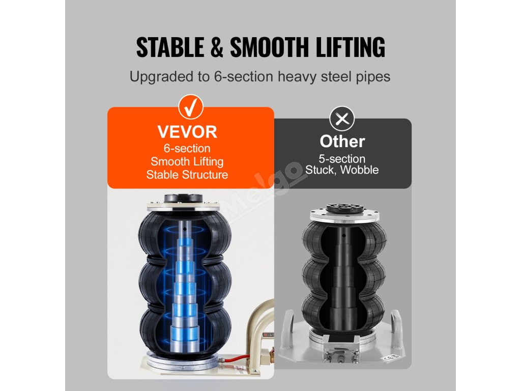 Náš vzduchový kladkostroj se 3 vaky je vybaven vnitřně optimalizovanými zvedacími díly, které nahrazují tradičních 5 ocelových trubek 6 ocelovými trubkami. Tato vědecká konstrukce zvyšuje stabilitu a zajišťuje plynulé zvedání. I při práci s těžkými vozidly se můžete spolehnout na to, že náš kladkostroj neuvízne.