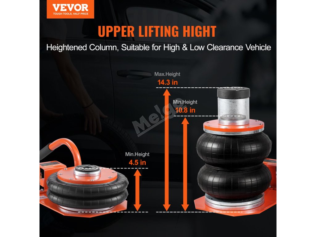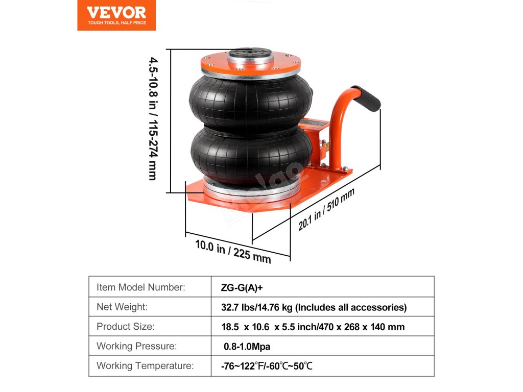 Bez zvedání je výška vzduchového zvedáku pouze 4,5 palce. Je vybaven protiskluzovými zvedacími rukojeťmi pro lepší umístění pod vozidlem, což účinně řeší problém zvedání vozidel s nízkým podvozkem.
