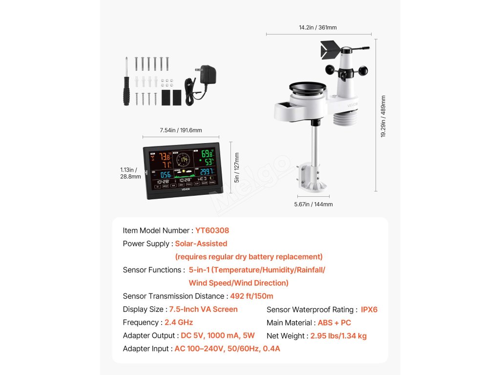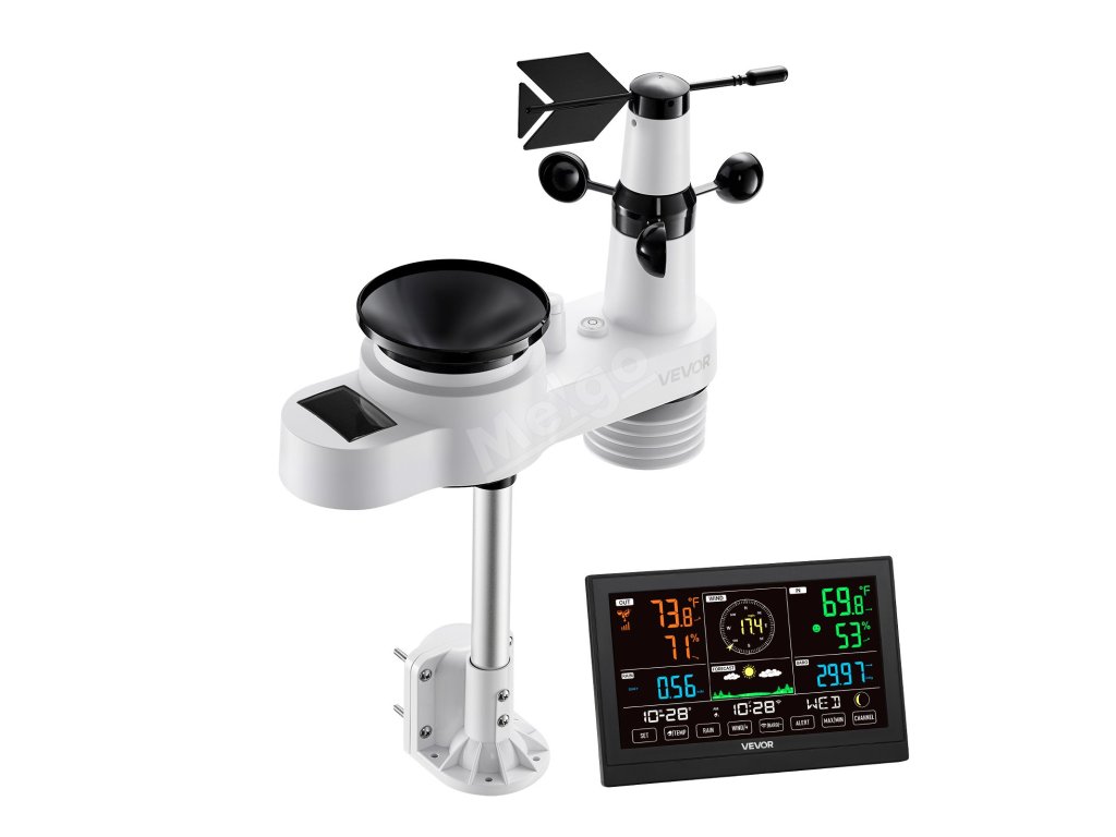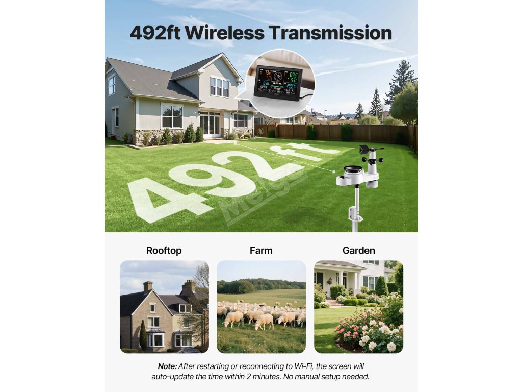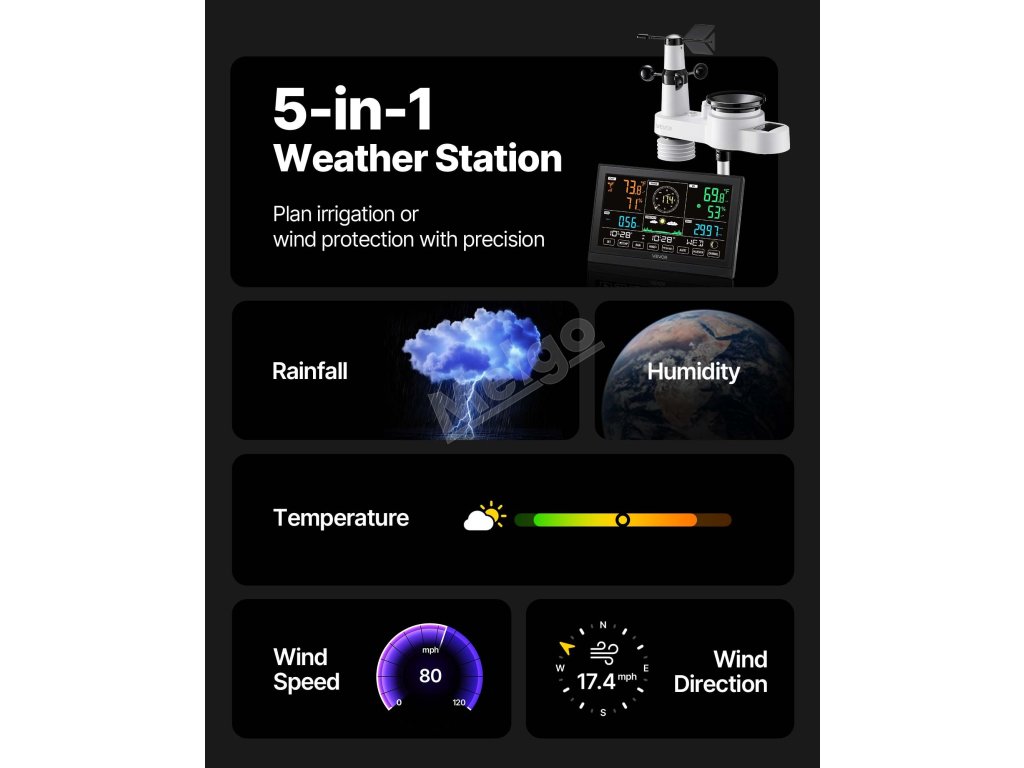 Naše bezdrátová meteostanice monitoruje teplotu, vlhkost, srážky, rychlost a směr větru - vše se přehledně zobrazuje na 7,5palcovém displeji. Díky dosahu bezdrátového přenosu 492 stop (150 m) a vodotěsnému venkovnímu senzoru IPX6 je vhodná pro venkovní použití a je efektivně napájena solárními panely.