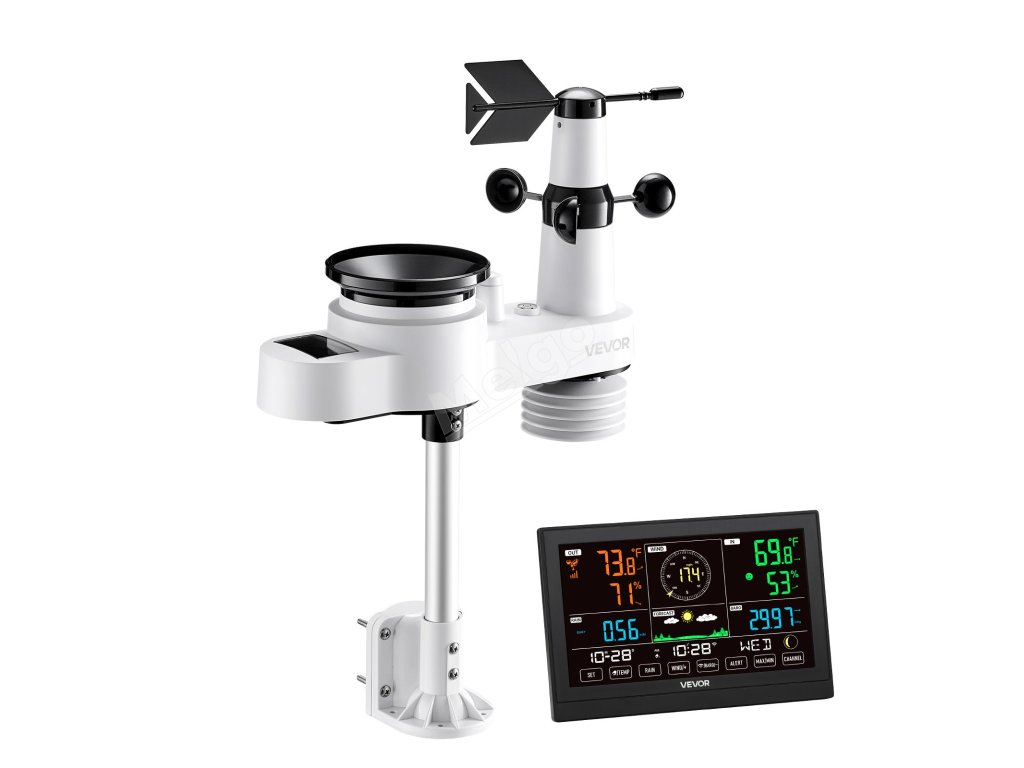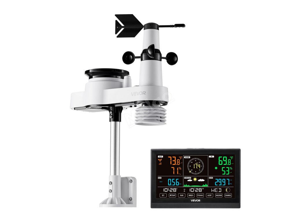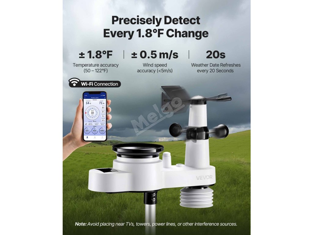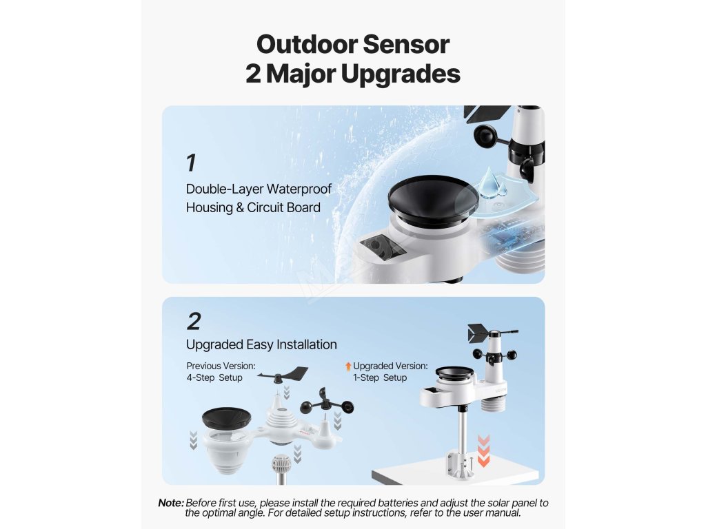 Naše bezdrátová meteostanice monitoruje teplotu, vlhkost, srážky, rychlost a směr větru - vše se přehledně zobrazuje na 7,5palcovém displeji. Díky dosahu bezdrátového přenosu 492 stop (150 m) a vodotěsnému venkovnímu senzoru IPX6 je vhodná pro venkovní použití a je efektivně napájena solárními panely.
