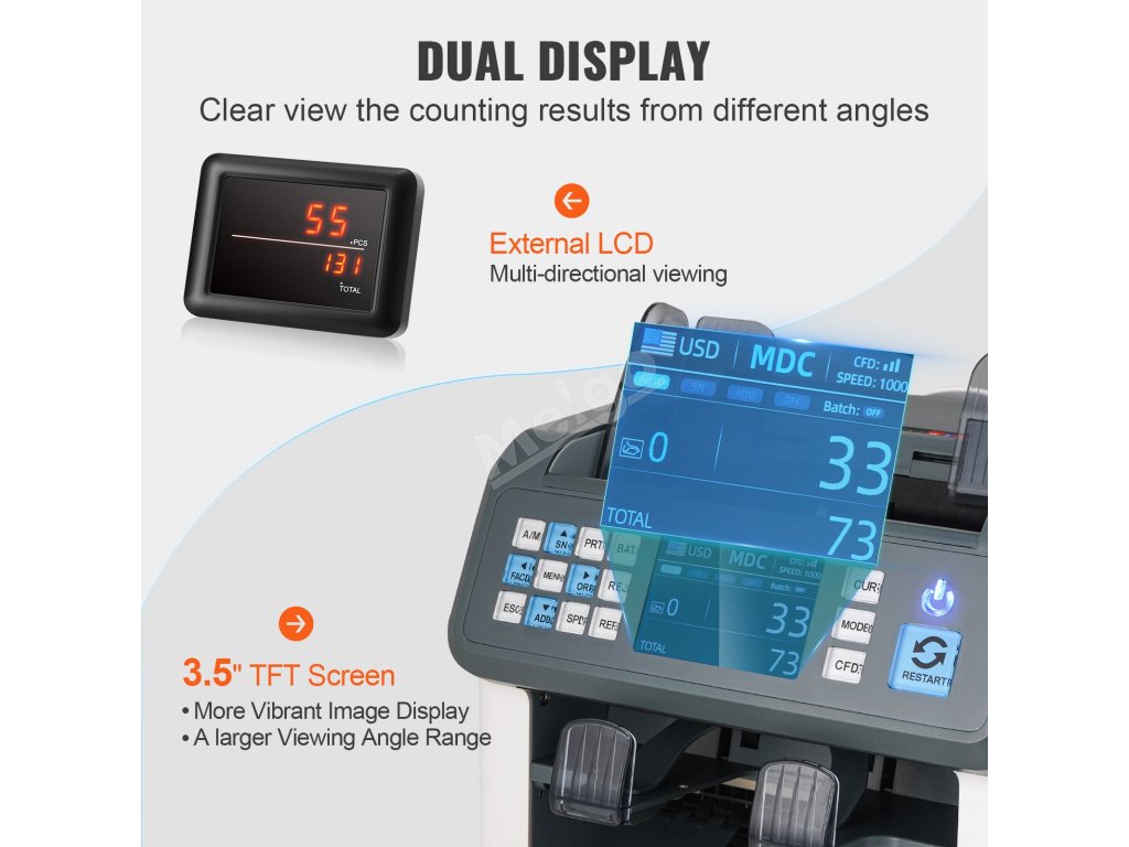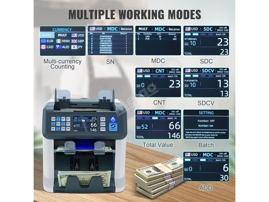 Naše počítačka bankovek podporuje počítání hodnoty ve více měnách pro několik hlavních měn (USD/EUR/GBP/CAD/MXN/AUD/JPY). Dokáže počítat počet i nominální hodnotu bankovek a nabízí různé režimy počítání včetně MDC, SDC, CNT, SDCV, celkové hodnoty, sčítání, dávky a třídění podle orientace nebo nominální hodnoty.