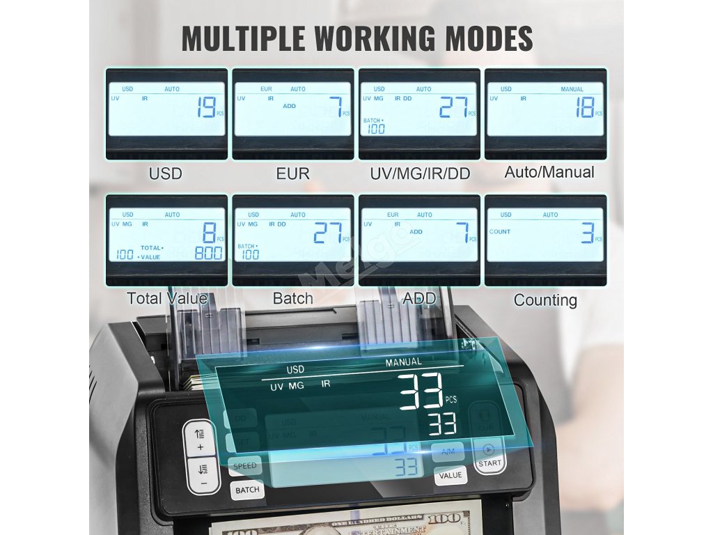 Naše počítačka peněz zvládá práci s USD i EUR a nabízí různé pracovní režimy, jako je počítání, výpočet celkové hodnoty, sčítání, dávkování a automatické/manuální počítání, které splňují různé potřeby. Díky těmto funkcím můžete výrazně zvýšit efektivitu při práci s hotovostí.