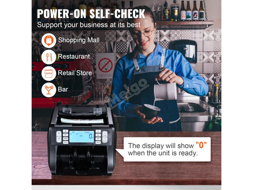 Naše počítačka peněz má po zapnutí funkci samokontroly pro optimální výkon, přenosnou rukojeť pro snadnou přepravu a kompletní balení se vším, co potřebujete k okamžitému zahájení počítání hotovosti. Je ideální pro malé podniky, čerpací stanice, maloobchody, restaurace, bary a další.