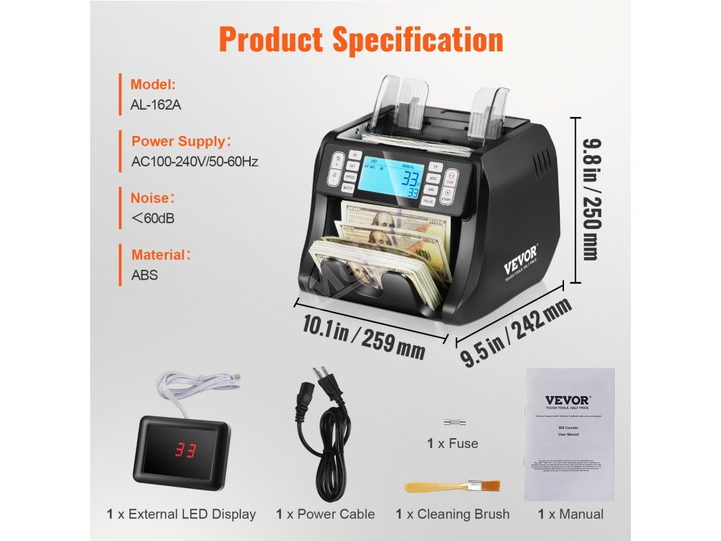 Se čtyřmi pokročilými detekčními metodami a několika režimy počítání je počítání hotovosti s počítačkou bankovek VEVOR hračka. Ať už provozujete malou firmu nebo velkou organizaci, počítačka hotovosti VEVOR je nepostradatelným nástrojem, který vám ušetří čas i peníze.