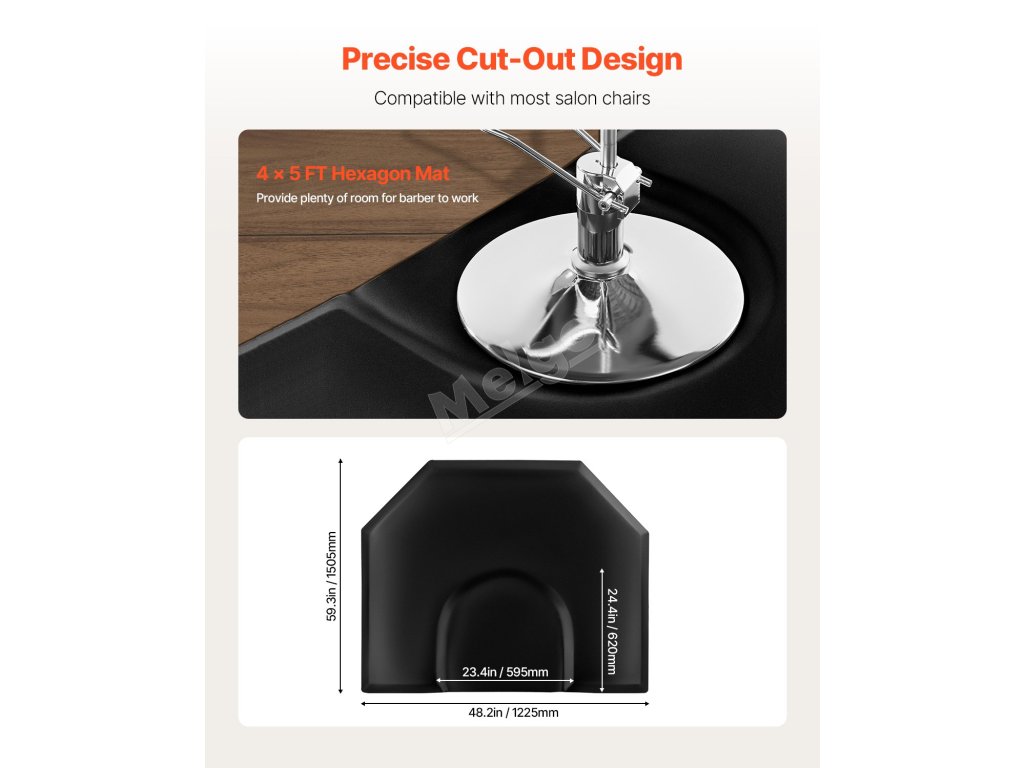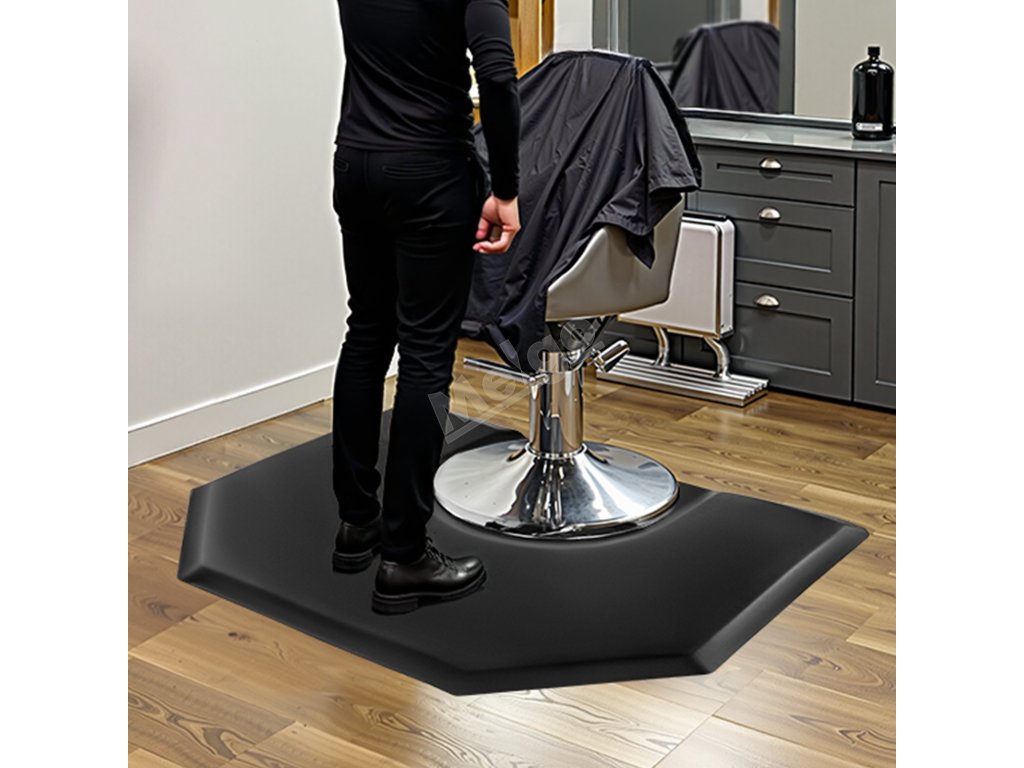 Naše šestihranná podložka pod křeslo v salonu o rozměrech 1225 x 1505 mm nabízí prostornou plochu pro stání, která holičům umožňuje volnou a pohodlnou práci. A výřez o rozměrech 595 x 620 mm (23,4 x 24,4 palce) je vhodný pro většinu salonních křesel s kulatou základnou. (Před objednáním si prosím změřte základnu židle, abyste se ujistili, že sedí)