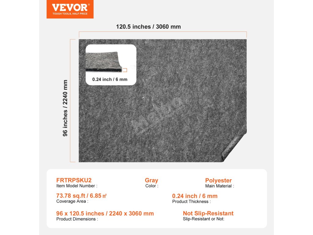 Podložka pod koberec 8'×10', 1/4" hrubá, 100% polyesterový filc, šedá