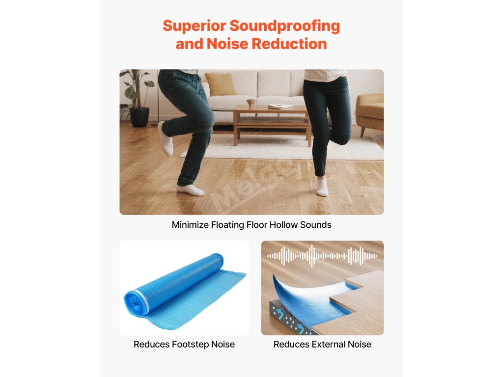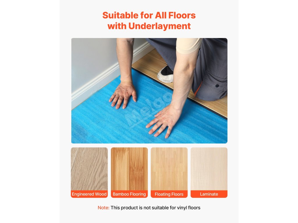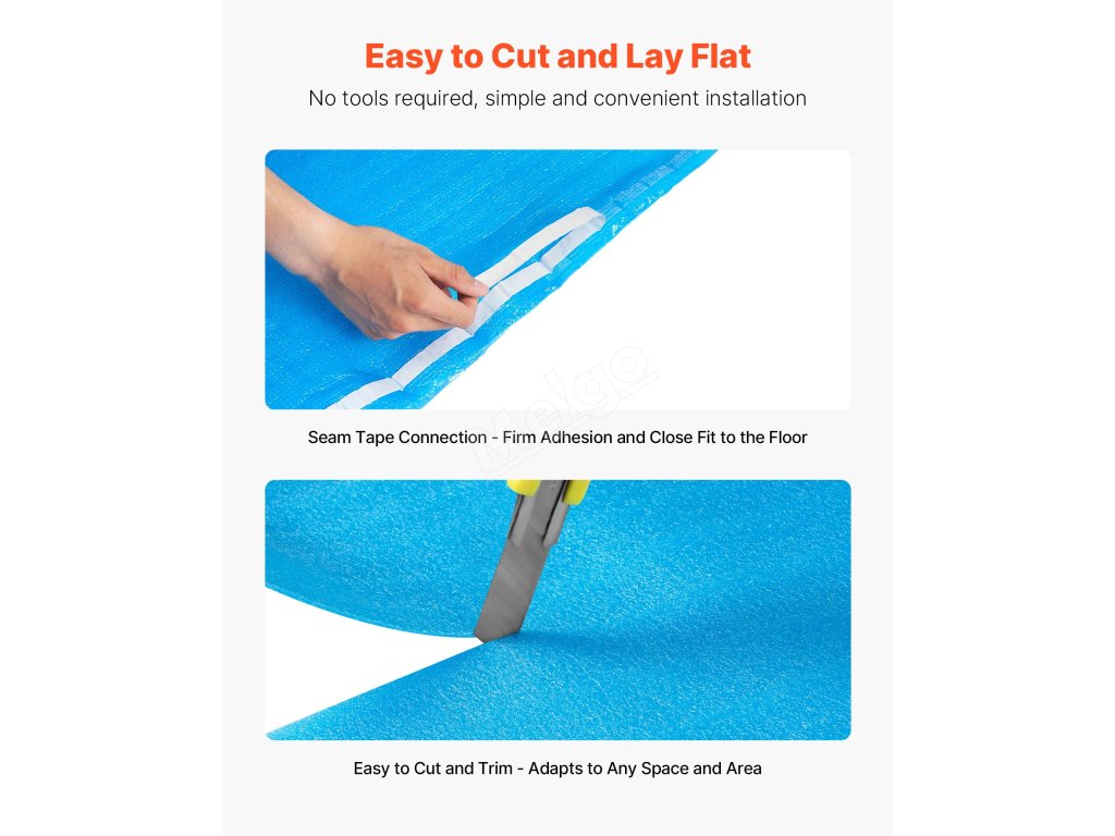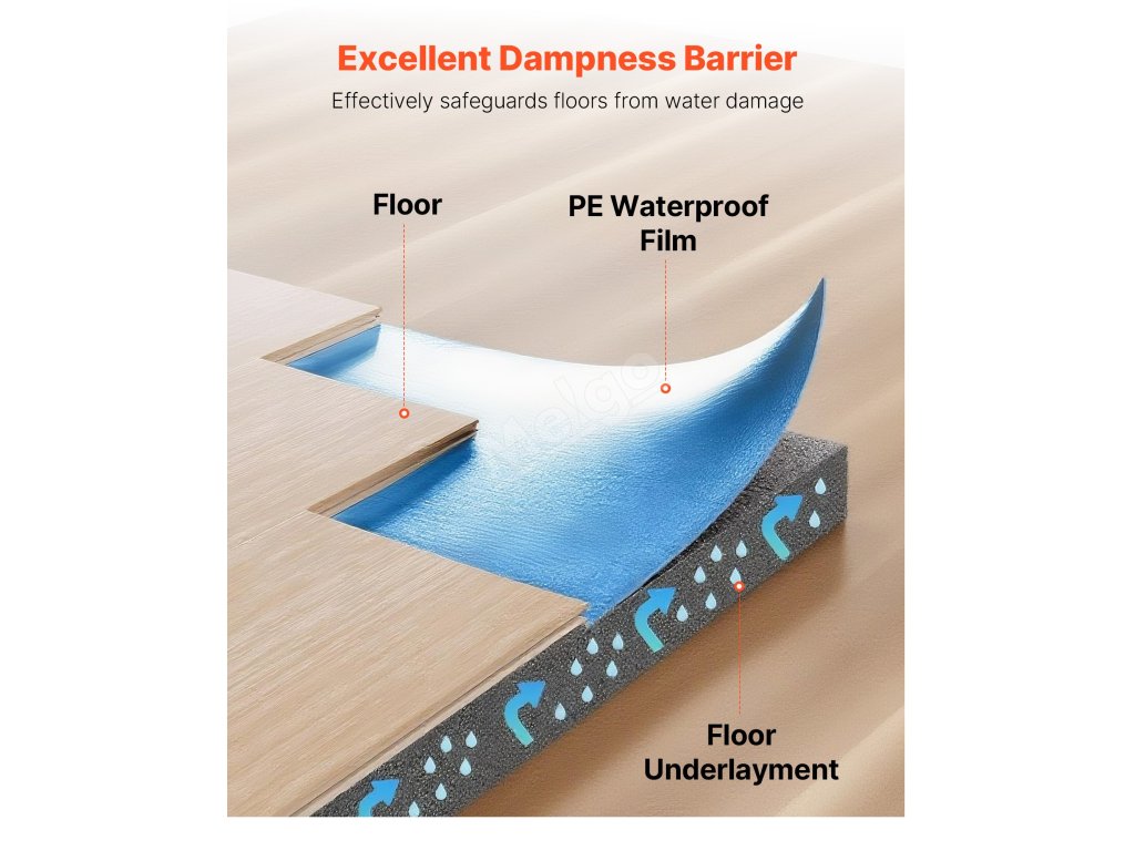 Tato podlahová rohož je ideální pro rozsáhlé instalace, které šetří čas a materiál. Její vysoce kvalitní pěna snižuje hlučnost a vodotěsná PE fólie zabraňuje deformaci podlahy. Snadno se řeže a instaluje a je kompatibilní s umělými dřevěnými, bambusovými a laminátovými podlahami.