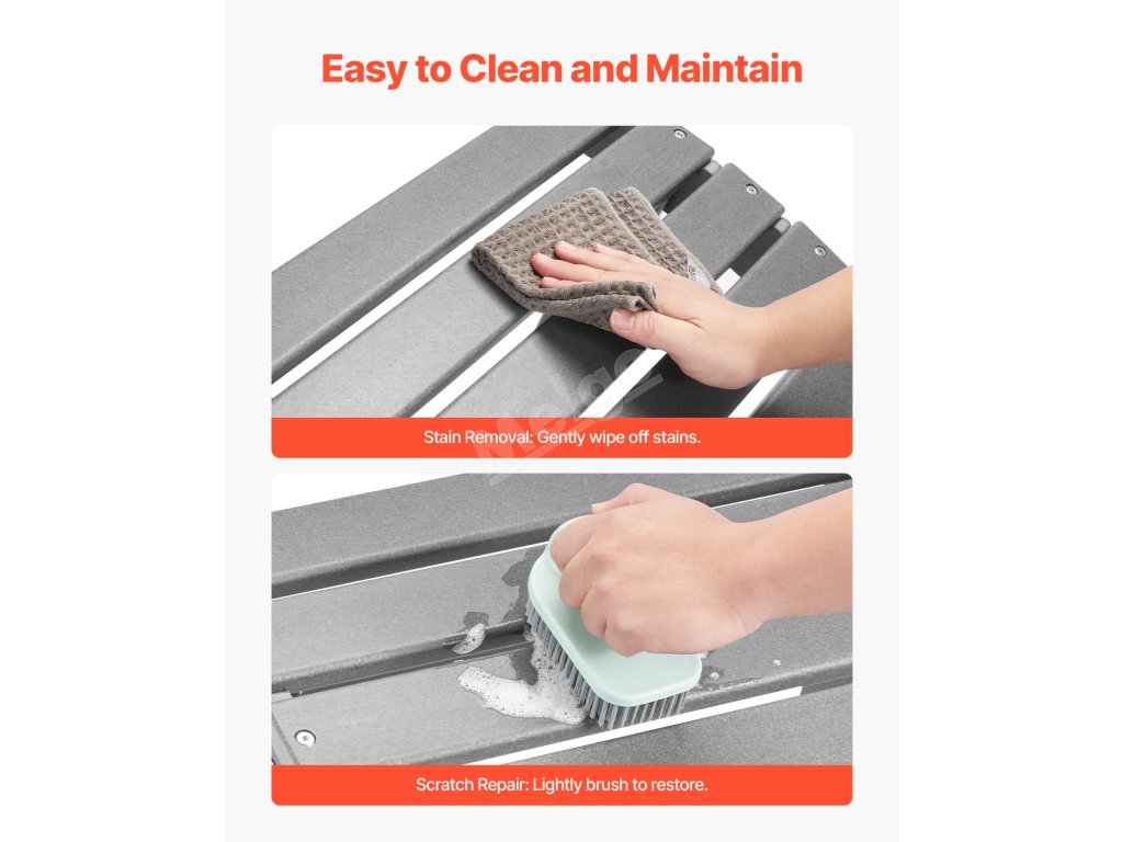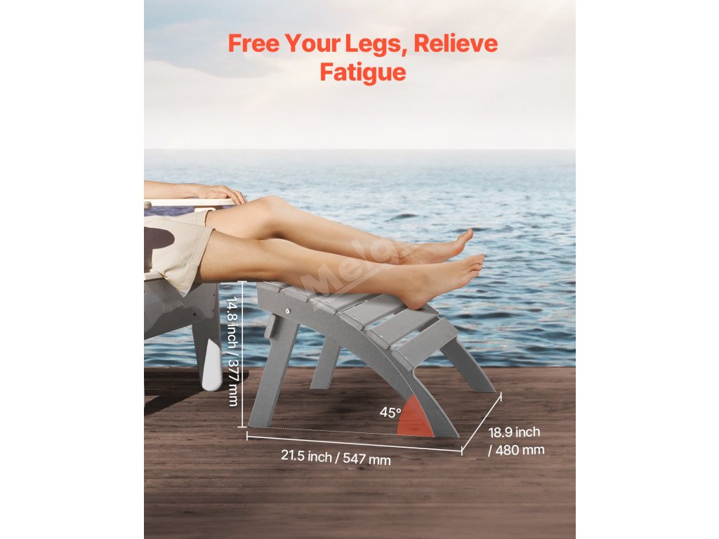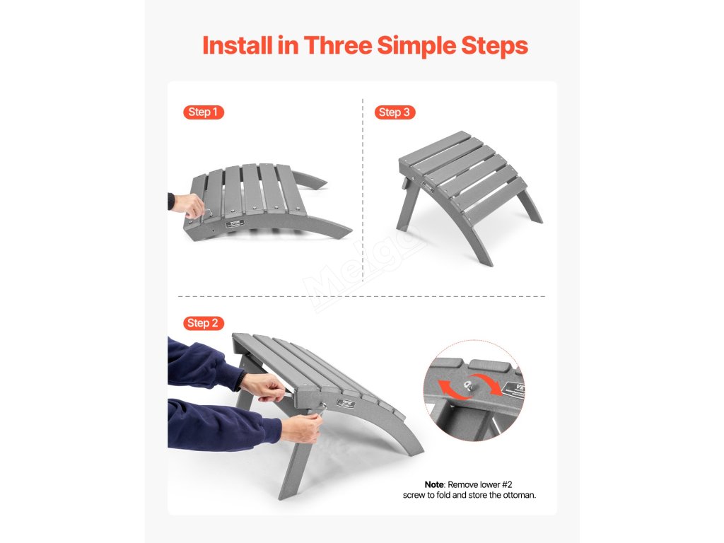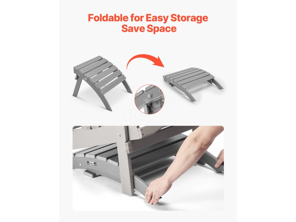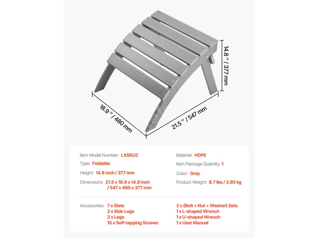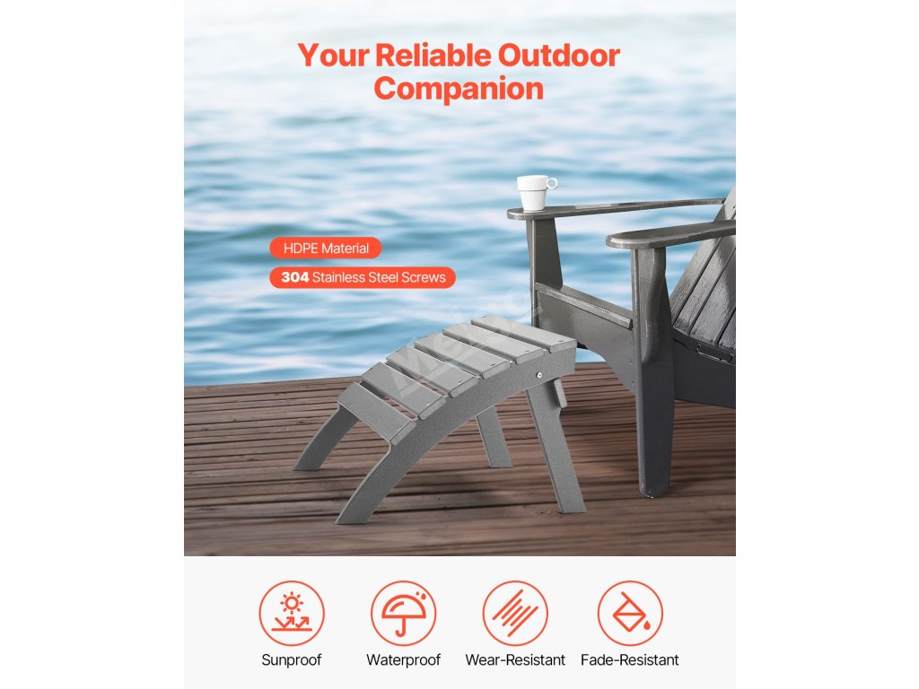 Otoman Adirondack je vyroben z odolného materiálu HDPE se šrouby z nerezové oceli 304 odolné proti korozi. Je skládací pro snadné skladování, instaluje se ve 4 krocích a má pohodlnou výšku 14,8 palce s úhlem 45 stupňů. Ideální pro různá venkovní prostředí.