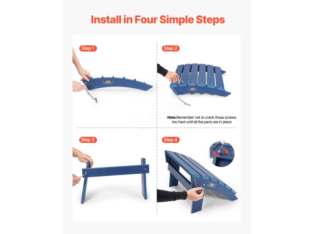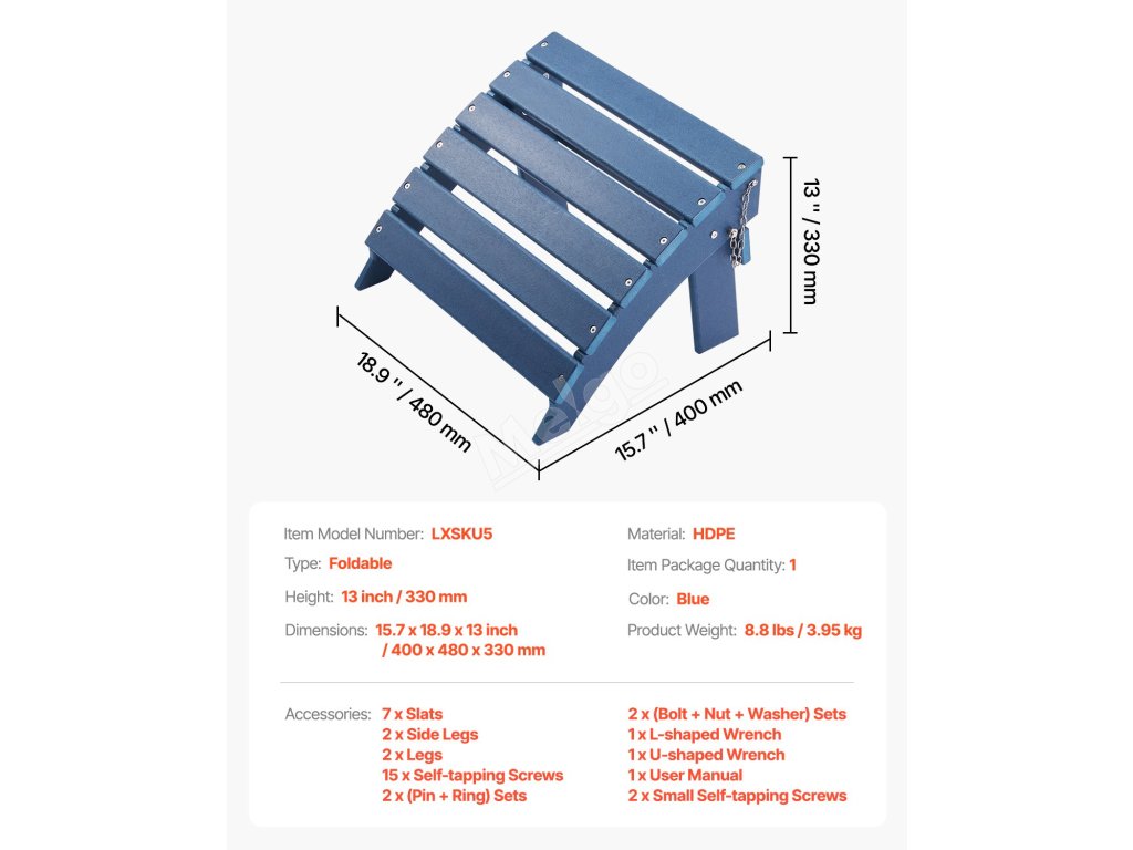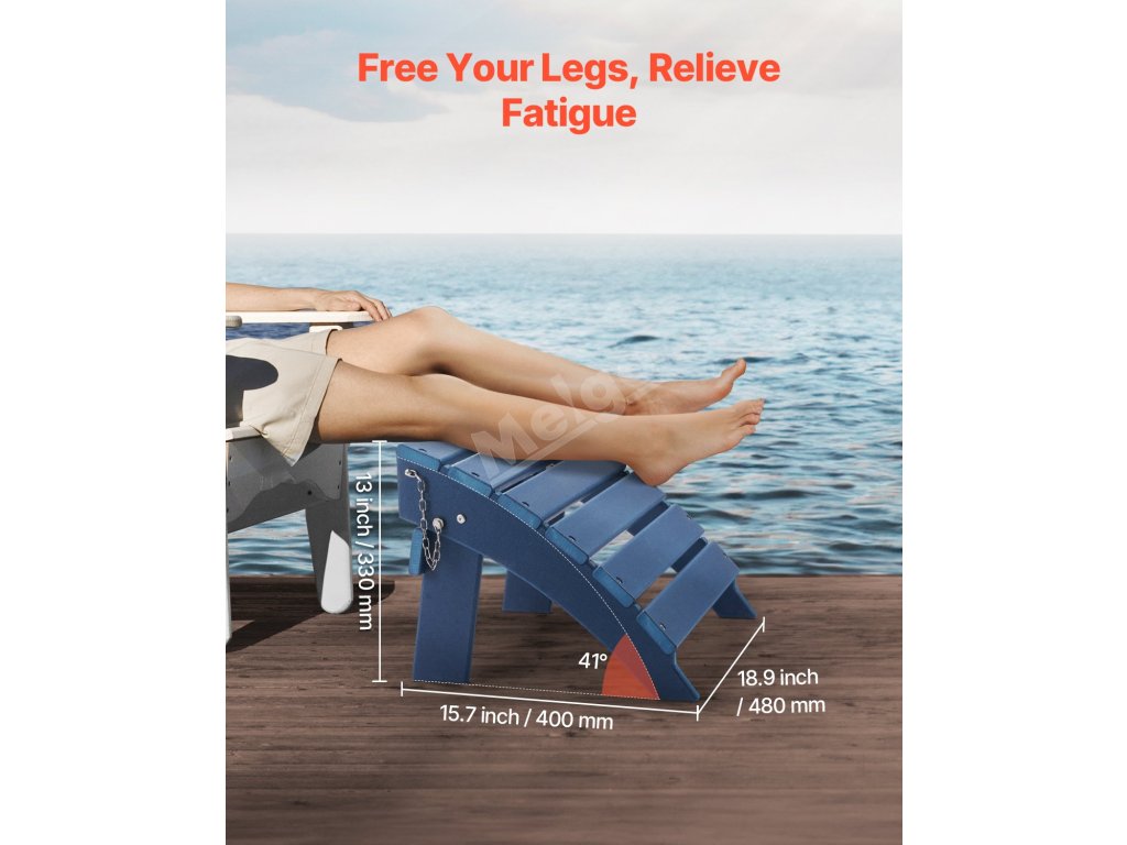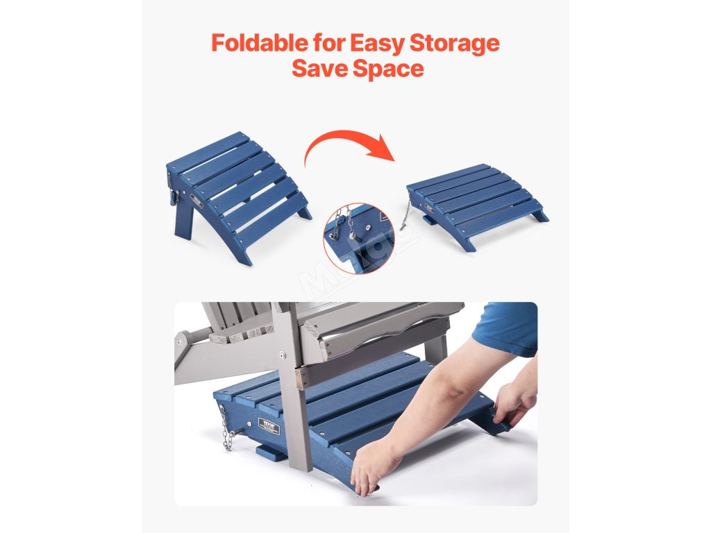 Otoman Adirondack je vyroben z odolného materiálu HDPE se šrouby z nerezové oceli 304 odolné proti korozi. Je skládací pro snadné skladování, instaluje se ve 4 krocích a má praktickou výšku 13 palců s úhlem 41 stupňů. Ideálně se hodí do různých venkovních prostředí.