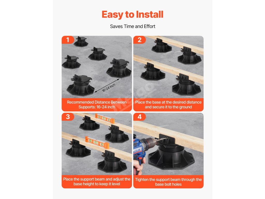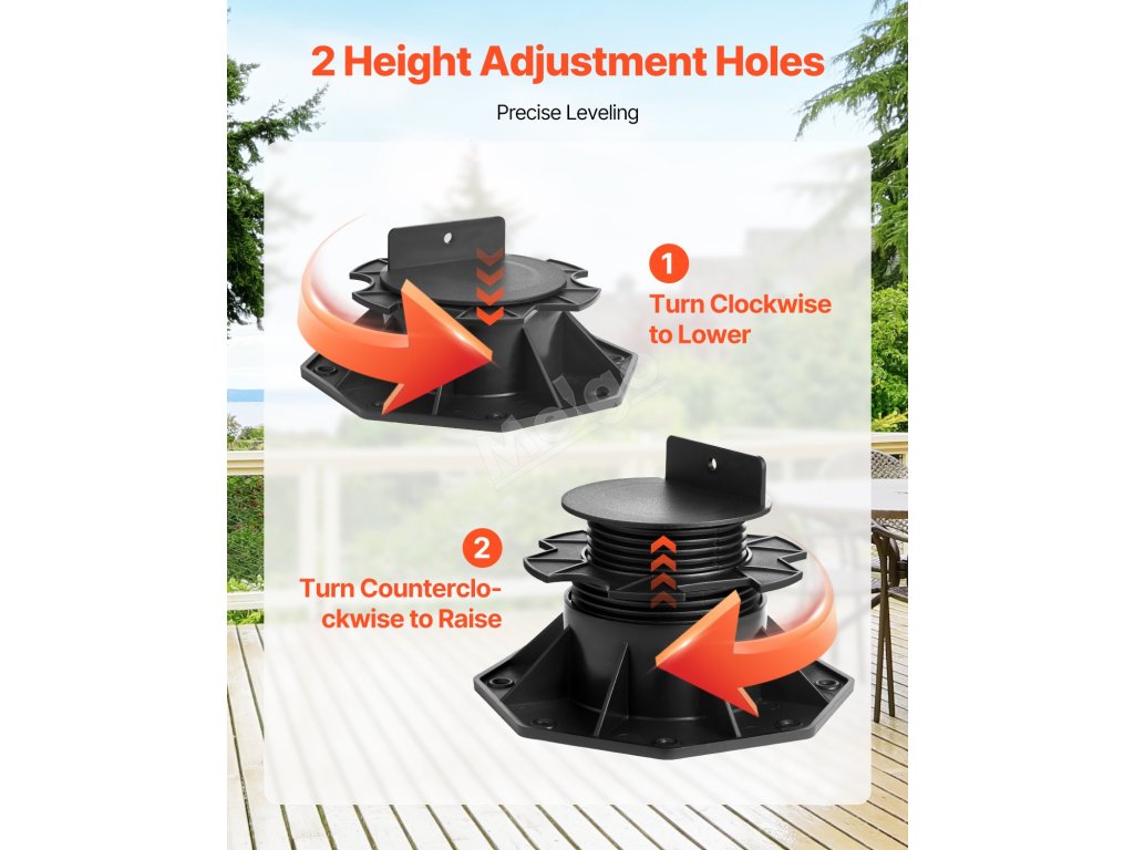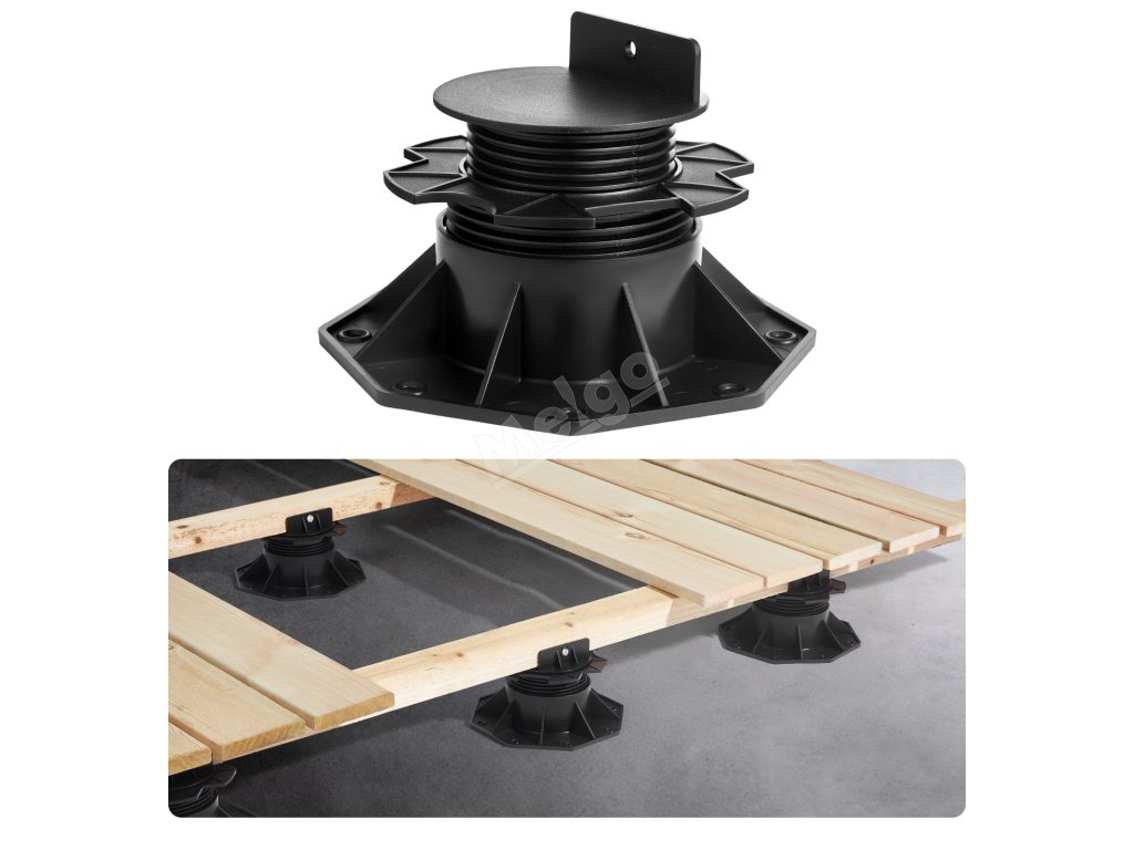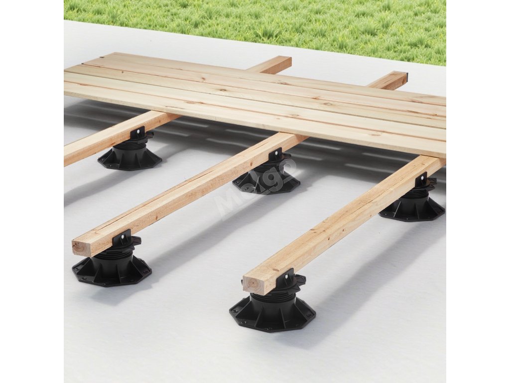Náš nastavitelný podstavec udržuje ideální vzdálenost od země, izoluje vlhkost a vytváří účinný odvodňovací systém. Zabraňuje poškození dřeva vlhkostí a korozi a zároveň skrývá kabely nebo trubky pro větší bezpečnost a odolnost.
