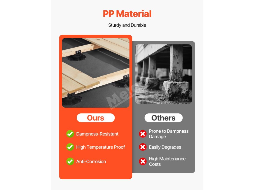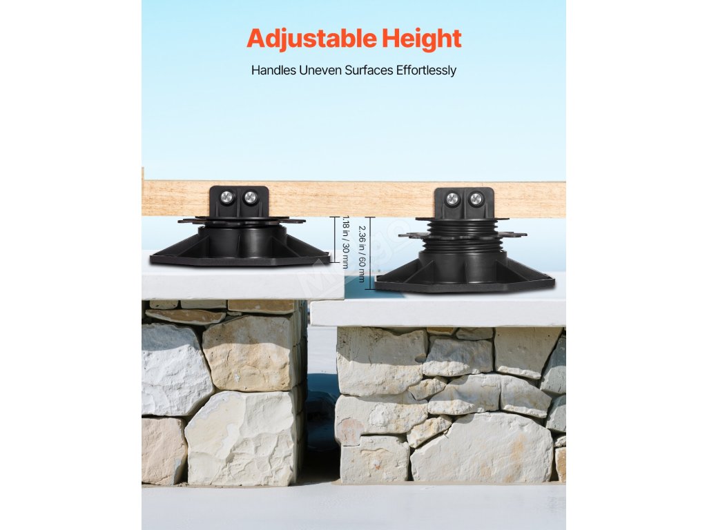 Naše podpěrné podstavce pro palubu jsou trvanlivé a odolné proti vlhkosti a korozi a jsou vyrobeny z vysoce pevného materiálu PP. Jsou nastavitelné od 1,18 do 2,36 palce, snadněji se instalují a přemisťují než tradiční dřevěné sloupky, ideální pro terasy, venkovní terasy, houpací plošiny, fontány a další.