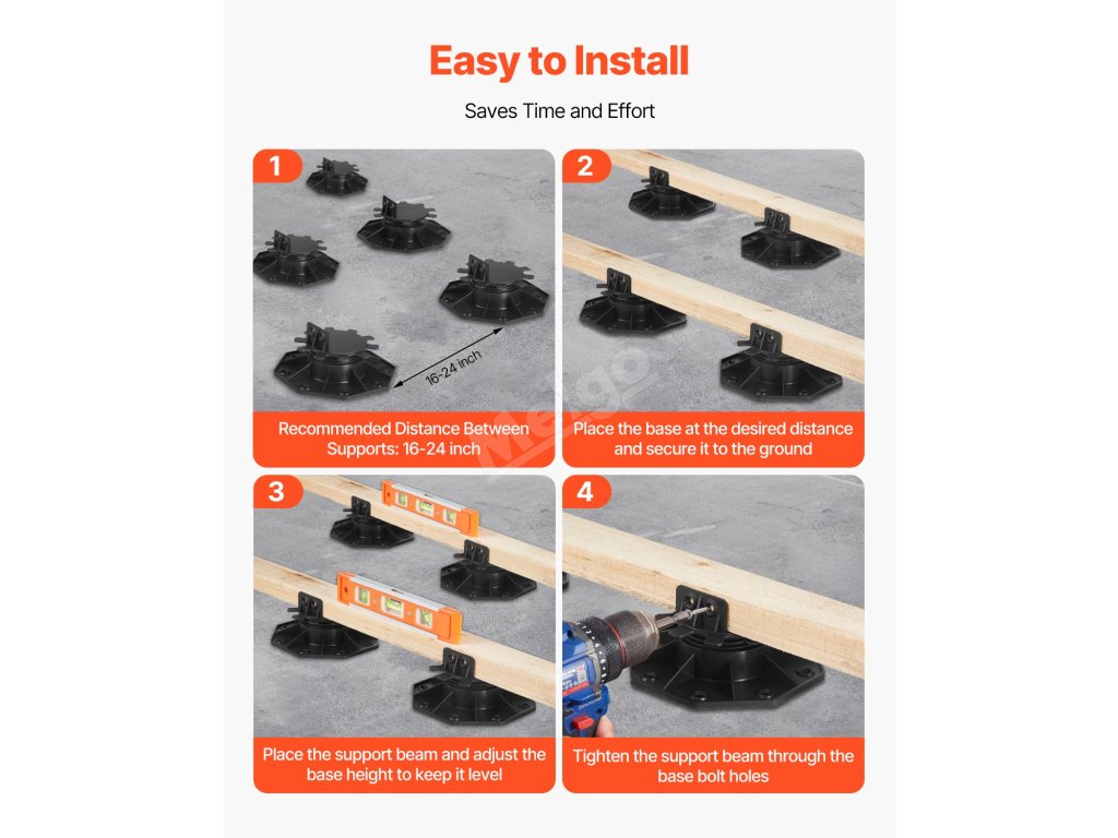 Náš nastavitelný podstavec udržuje ideální vzdálenost od země, izoluje vlhkost a vytváří účinný odvodňovací systém. Zabraňuje poškození dřeva vlhkostí a korozi a zároveň skrývá kabely nebo trubky pro větší bezpečnost a odolnost.