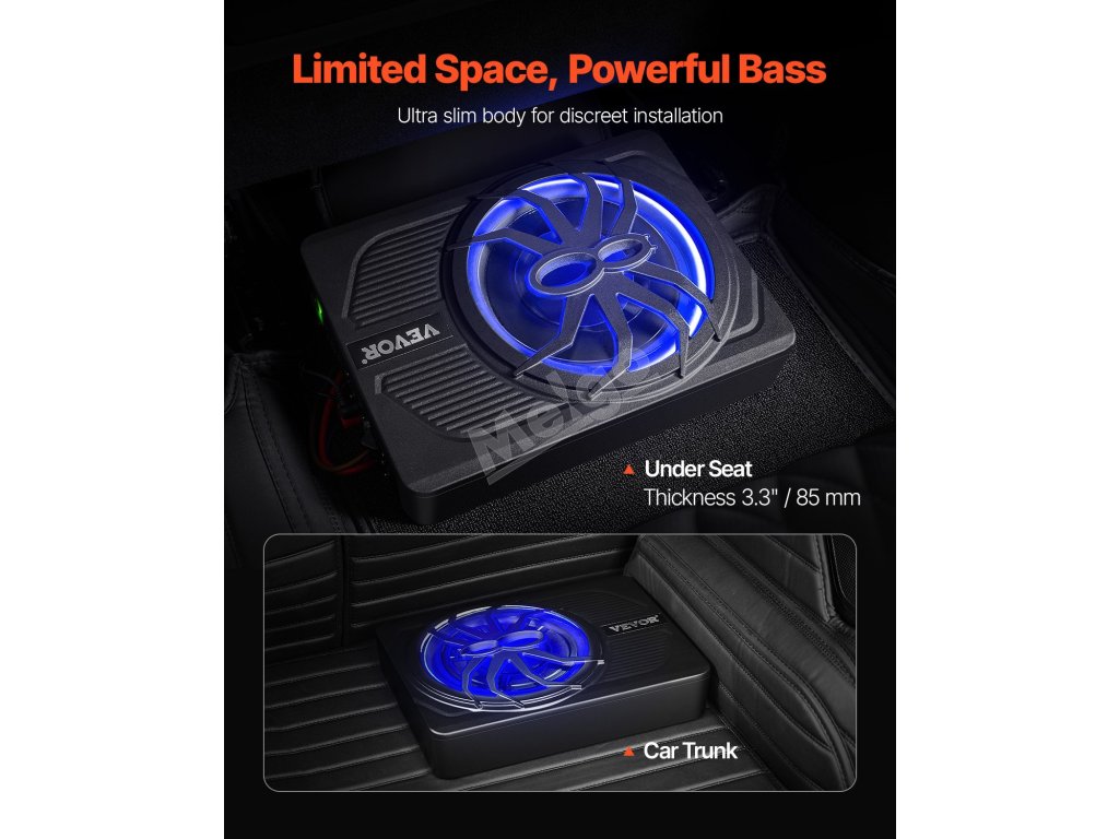 Tento 10" subwoofer pod sedadlo je nezbytnou výbavou pro milovníky automobilového audia, protože poskytuje silné basy a čistý zvuk a zároveň šetří místo díky svému tenkému 3,3" profilu. Je vybaven vstupem pro vysokou/nízkou úroveň, maximálním výkonem 440 W a modrým náladovým světlem, čímž posune váš zvukový zážitek na novou úroveň ve velkém stylu.