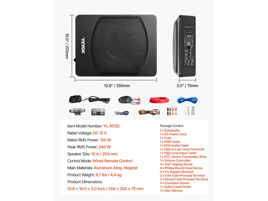 Tento 10" subwoofer do auta pod sedadlo je nevyhnutnou výbavou pre nadšencov automobilového audia, pretože poskytuje silné basy a čistý zvuk a zároveň šetrí miesto vďaka svojmu štíhlemu 3,0" profilu. Je vybavený vstupom pre vysokú/nízku úroveň a maximálnym výkonom 240 W, čím výrazne pozdvihne váš zvukový zážitok na ďalšiu úroveň.